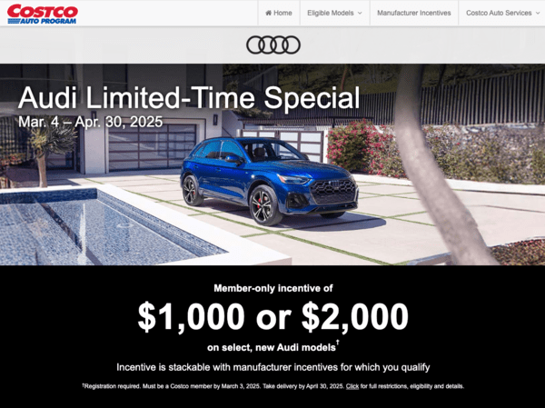 최근 미국 코스트코는 자동차 구매 프로그램을 이용하는 회원을 대상으로 특정 아우디 모델을 최대 2,000달러 할인된 가격에 구매할 수 있도록 했다. 전기차(EV)뿐만 아니라 내연기관 차량(ICE)도 포함된다.