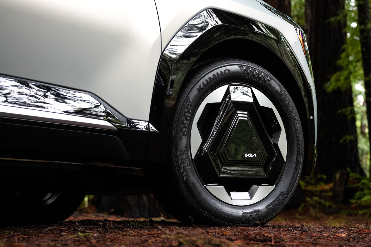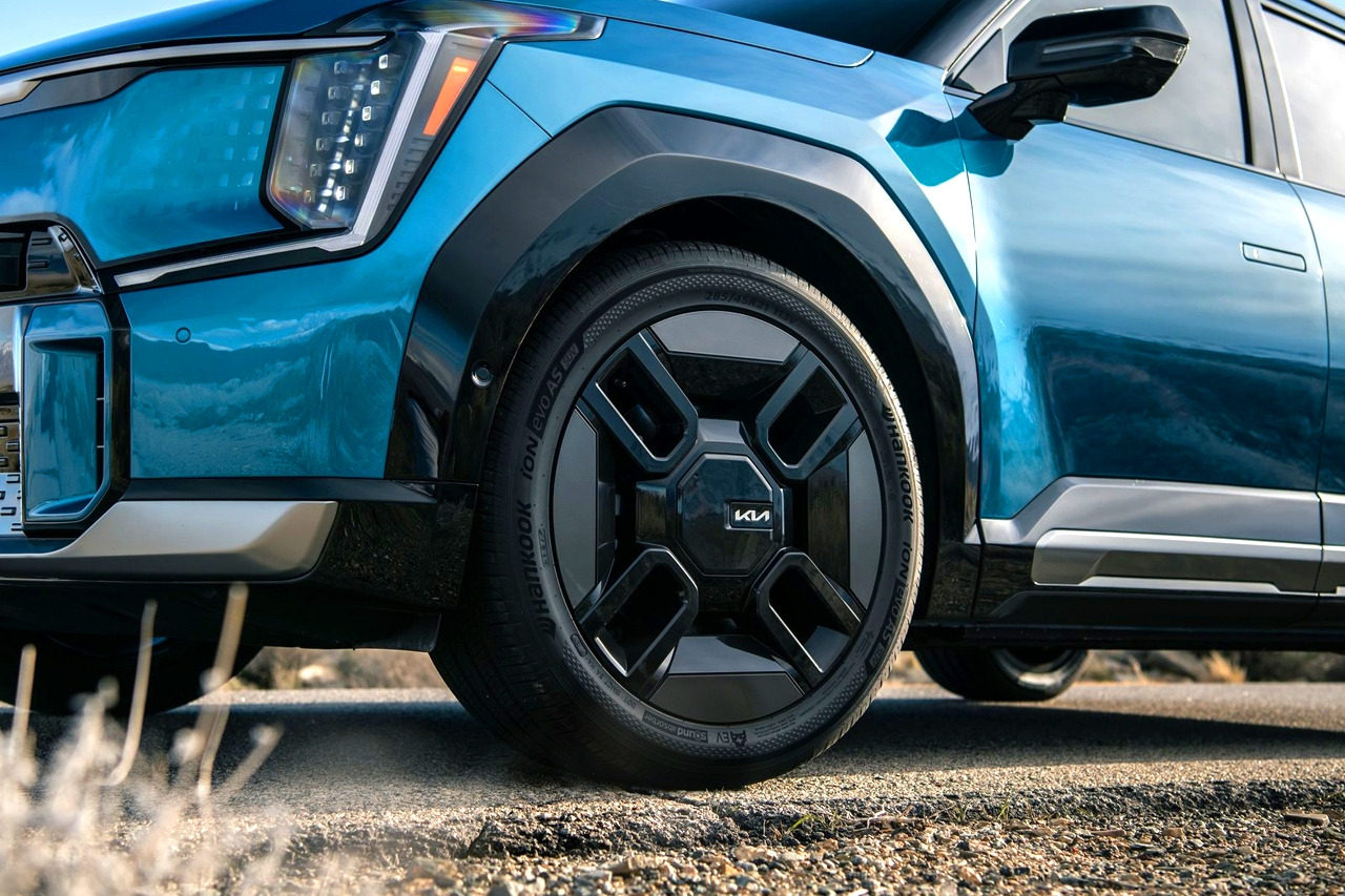 외장에서의 특징적인 디자인 요소를 딱 하나만 꼽자면, 휠 디자인이다. 자동차에서는 세모, 네모 같은 도형을 사용하는 것이 어렵고, 시작적으로 예쁘게 구현하기가 힘들다. 현대자동차도 최근들어 파라메트릭 다이내믹스로 이런 도형을 구현하고 있는 실정인데, 기아가 과감하게 EV9의 휠 디자인에 도형을 집어 넣었다. 심지어 대형 SUV에.