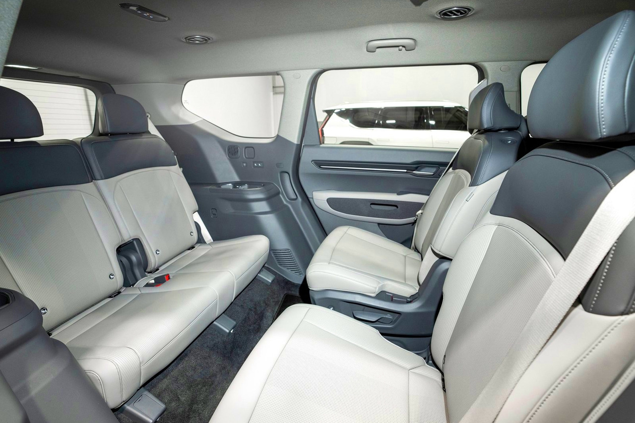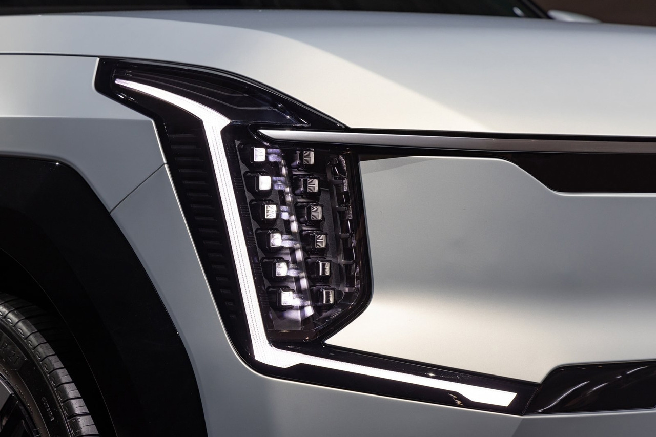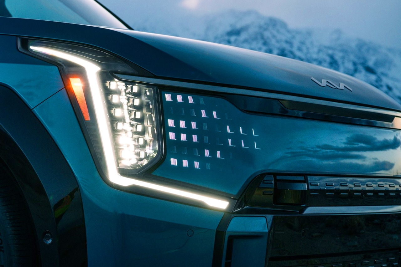 EV9의 전면부는 ‘디지털 패턴 라이팅 그릴’과 ‘스몰 큐브 프로젝션 LED 헤드램프’, ‘스타맵 LED DRL(주간주행등)’ 등 깔끔한 차체 면과 다양한 조명으로 미래 지향적 느낌을 구현했다.