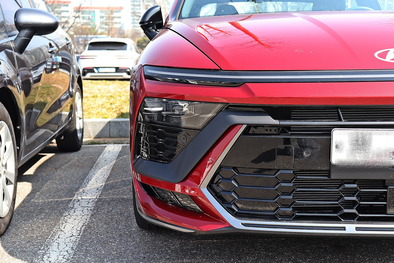 범퍼는 사다리꼴 형태의 그릴과 분할형 헤드램프, 공기흡입구가 하나로 이어진 통합형 디자인을 채택했다. N라인은 무광 블랙 가니시와 스포티함을 강조한 범퍼 하단은 정지 상태에서도 차가 앞으로 내달리는듯한 역동성을 부여한다.