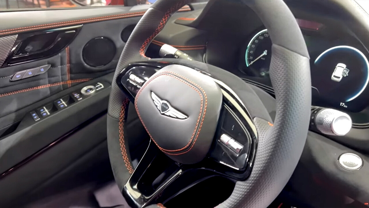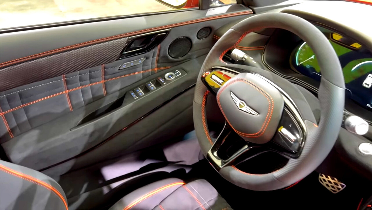 모크리티비는 현장에서 실내를 둘러보며 "GV80 쿠페 콘셉트의 실내는 전반적으로 알칸타라 소재를 굉장히 많이 적용했다. 도어 트림에도 알칸타라가 적용되며, 탄소섬유(카본), 마그마 색상으로 포인트를 주었다."고 설명했다.