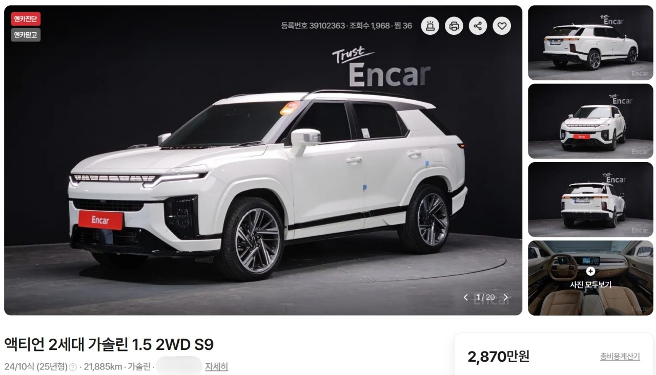 26일 기준 온라인 중고차 플랫폼 ‘엔카’에는 액티언 중고 매물이 98대 등록되어 있다. 지난해 8월 출시에 누적 판매량 6,428대에 불과한 것을 생각하면 적지 않은 수다. 일례로 비슷한 시기 출시해 세 배 이상 팔린 기아 EV3 매물은 85대다.