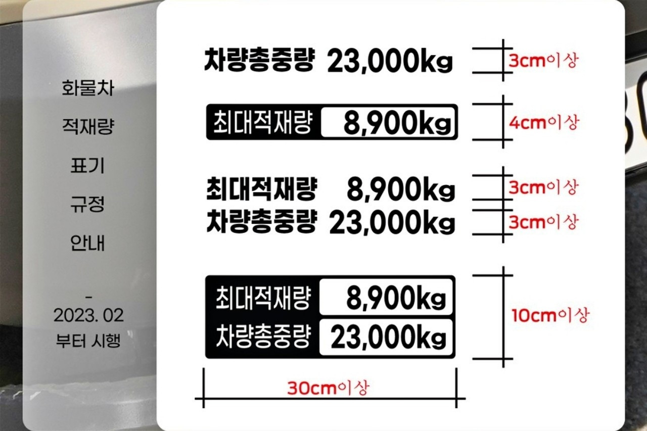 이에 의하면, 모든 화물차는 차량총중량과 최대적재량이 명기된 스티커 등을 최소 길이 30cm 이상, 최소 높이 4cm 이상(두 줄일 경우 10cm 이상)으로 붙여야 한다. 단, 차량총중량이 15톤 미만일 경우 차량총중량은 생략할 수 있다.