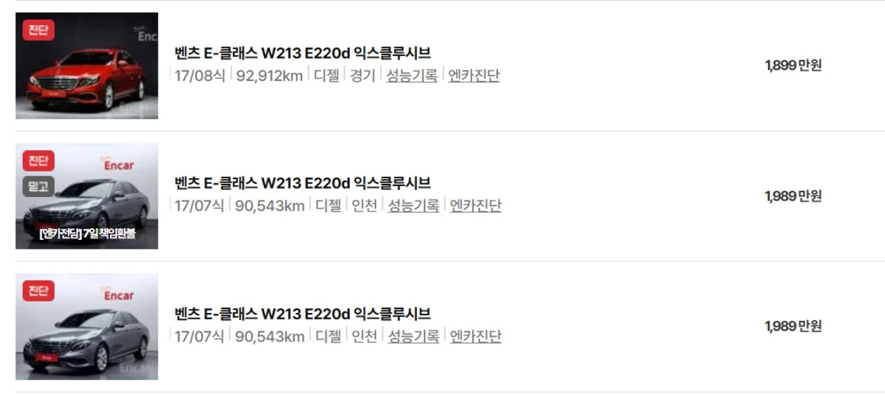 중고차 플랫폼 ‘엔카’ 온라인 페이지에 따르면, 2016년부터 2024년까지 판매된 10세대 W213 E-클래스 초기형은 누적 주행거리 10만 km 이하 무사고 기준 매물 가격이 평균 2천만 원 초중반대에 형성되어 있다.