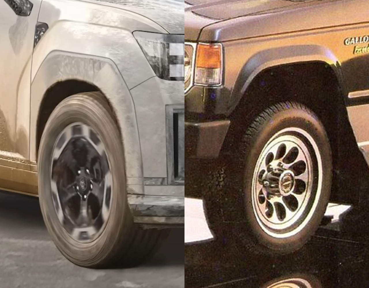 갤로퍼는 앞,뒤 휠하우스를 이루는 펜더 디자인이 사다리꼴 형태로 이루어져있다. 신형 싼타페 역시 휠하우스의 무광 클래딩과 그 바깥쪽을 각진 사다리꼴 형태로 구성했다. 전체적으로 각진 형태 가운데 거의 유일하게 볼륨감을 느낄 수 있는 부분이다.