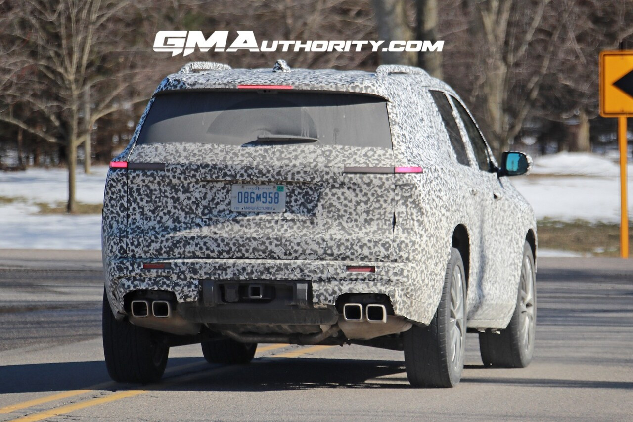 후면은 스파이샷을 통해 유추해 볼 수 있다. 기본적인 디자인은 현행 트래버스와 크게 다르지 않을 것으로 보인다. 현행 모델처럼 가로형 테일램프가 적용되는 것도 동일하다. 그러나 현행 모델보다 테일램프의 크기를 줄이고 LED를 사용해 고급감을 극대화할 것으로 예상된다. 또한 히든 타입 머플러 팁을 사용하는 모델들과 다르게 네모난 형태의 트윈 듀얼 머플러 팁을 사용해 내연기관 모델이라는 것을 강조한다.