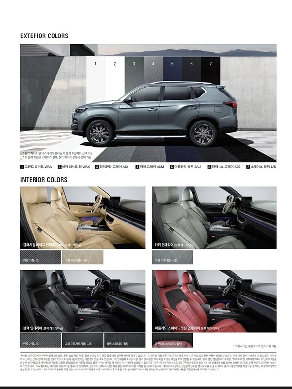 외관은 큰 차이가 없다. 기존 렉스턴의 블랙베젤 램프와 대형 크롬 라디에이터 그릴, 범퍼 디자인, 등 고급감을 강조한 부분 그대로다. 차이점은 20인치 휠 디자인이 새롭게 바뀐 정도다. 외관 색상은 그랜드 화이트, 실키 화이트 펄, 엘리멘탈 그레이, 마블 그레이, 아틀란틱 블루, 갤럭시스 그레이, 스페이스 블랙 등 7종이다.