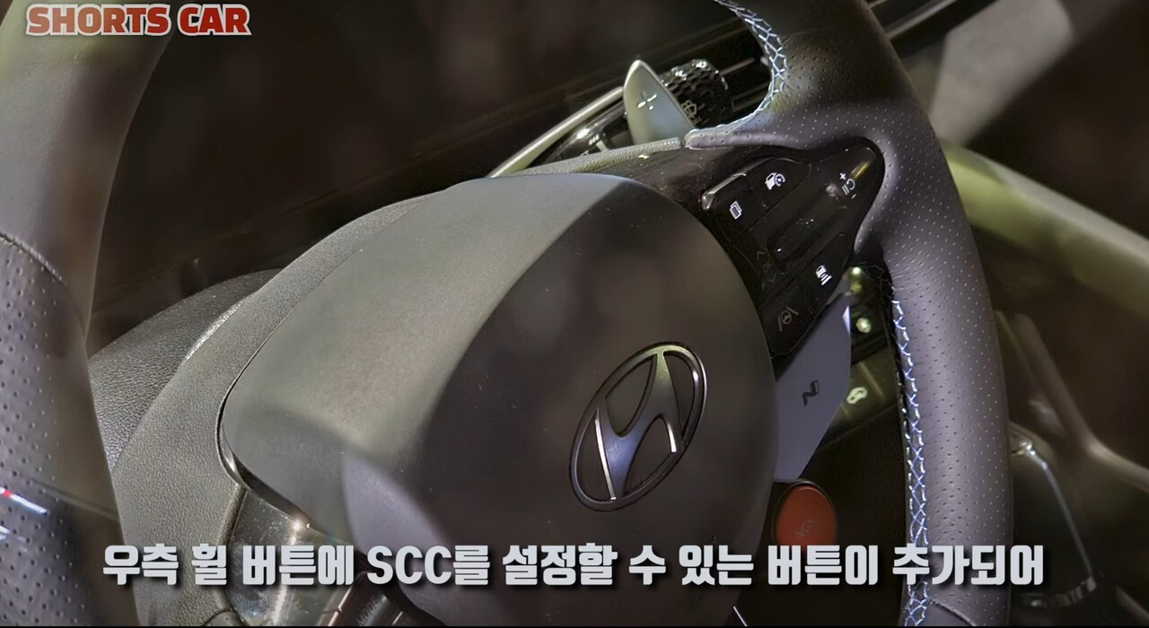 특히 스마트 크루즈 컨트롤이 추가됨에 따라 고속도로 주행 보조(HDA) 역시 아반떼 N에 신규 적용될 것으로 전망하고 있다. 실제로 스티어링 휠에 속도와 차간 간격 조절, 차로 중앙 유지 등을 위한 버튼들이 확인되었다.