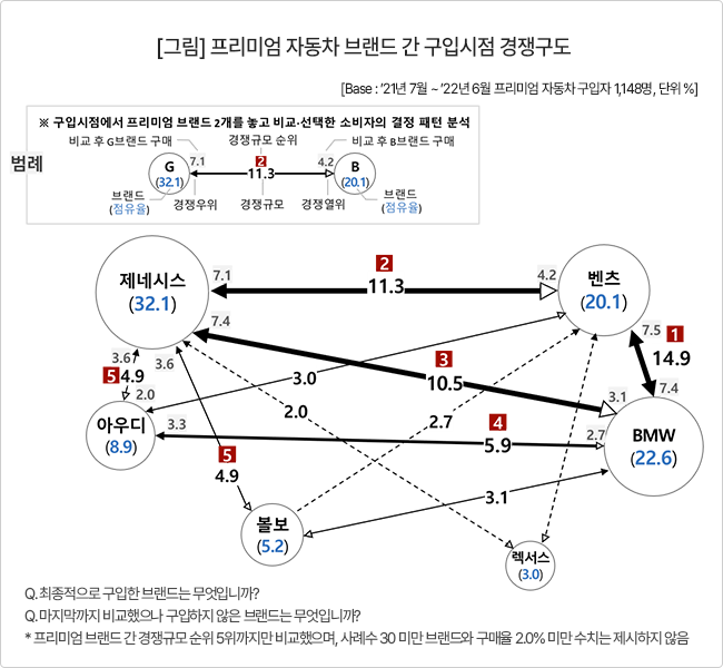 제네시스의 부상으로 벤츠와 BMW 간의 경합 강도는 과거에 비해 약화됐으나, 두 브랜드 간의 경쟁구도에는 변함이 없다. 경쟁규모는 14.9%로 여전히 프리미엄 브랜드 중 가장 많은 비교를 한 것으로 나타났다. 벤츠와 BMW를 저울질 한 끝에 7.5%가 벤츠를, 7.4%가 BMW를 최종 선택할 정도로 아직 팽팽한 경쟁구도를 형성하고 있다.