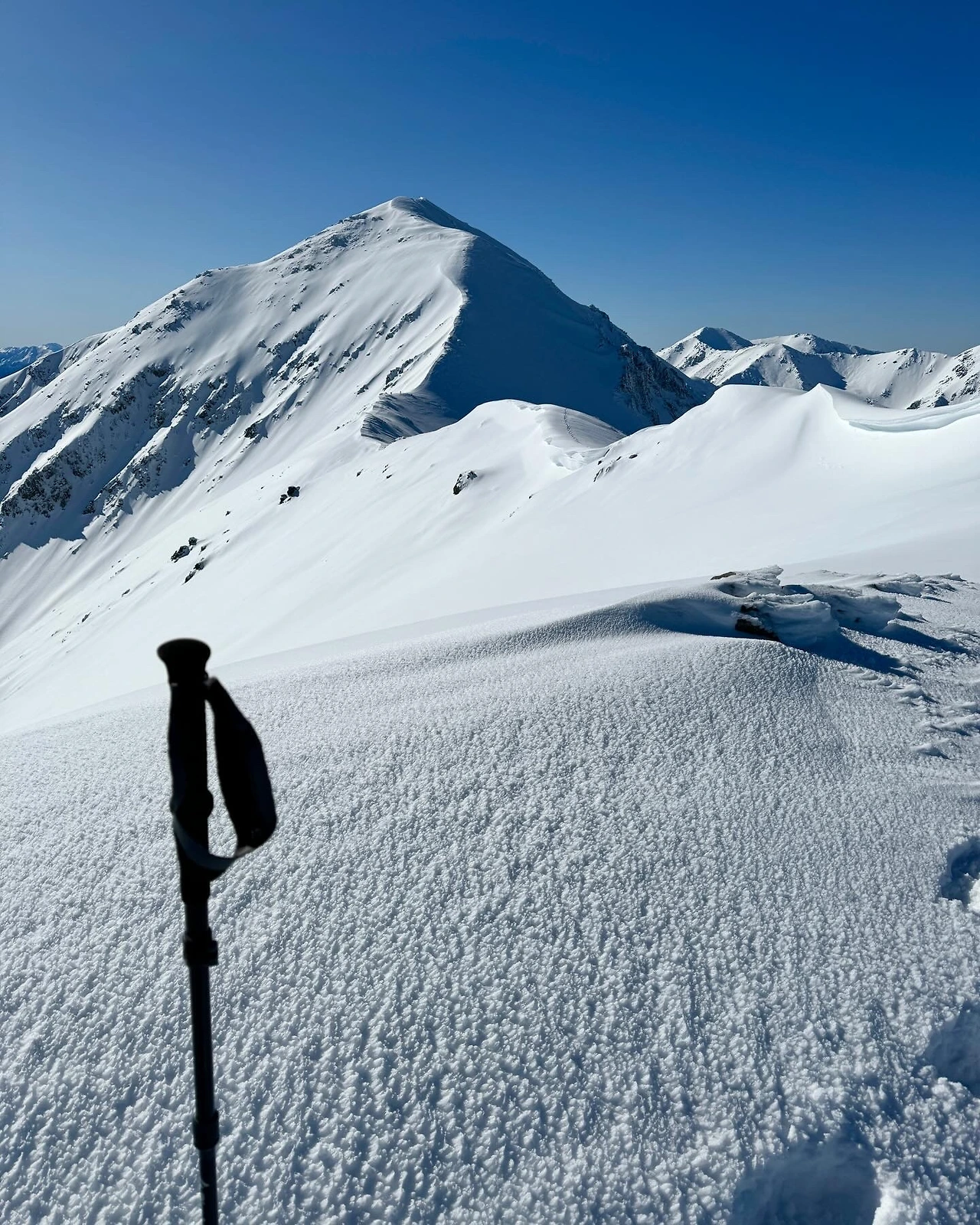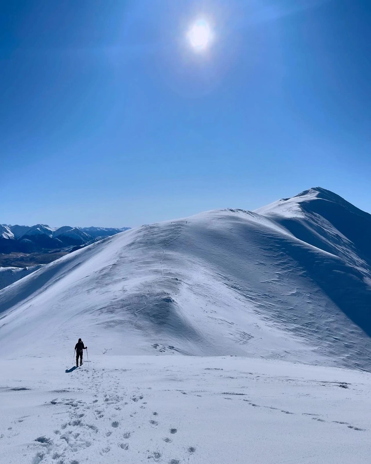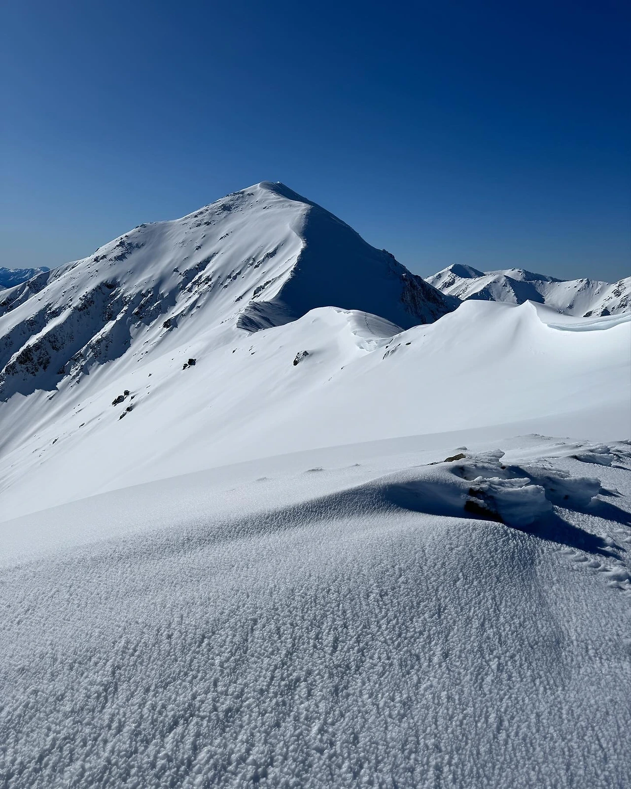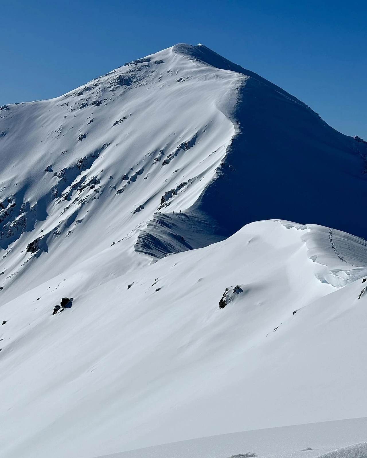매끄럽게 눈 덮인 높고도 거대한 산봉우리는 빛과 그림자의 극적인 대비 속에 놓여 있었다. 한쪽 면은 태양의 황금빛을 받아 찬란하게 빛나고, 다른 쪽은 깊고 짙은 그림자에 잠겨 있었다. 이 극명한 대조는 봉우리의 윤곽을 더욱 뚜렷하게 드러내며, 산의 힘과 웅장함을 더욱 돋보이게 했다. 마치 그것은 대자연이 거대한 붓으로 그린 수묵화처럼, 산봉우리는 빛과 어둠의 조화 속에서 그 위엄을 뽐내고 있었다. 그 앞에서 옴짝달싹 못한 채 발이 멈추어 버렸고 더 이상은 한걸음도 앞으로 뗄 수 없을 만큼 압도되었다. 아주 약간의 망설임이 들긴 했으나 남편에게 더 이상은 못 갈 것 같다는 대답을 했고 남편은 곧 수긍하며 받아들였다. 우리는 더 이상의 미련 없이 돌아가기로 결정을 했다. 등산은 99%의 행운이 아니라 1%의 불운에 대비해야 한다고 하지 않았던가. 어쩌면 순간의 무모함으로 되돌아올 수 없는 강을 건널 수도 있는 일이다. 1900m 가까이 달하는 지점까지 도달한 것만으로도 충분히, 아주 충분히 만족했다. 여기까지 올라오느라 수고 많았다고 인사를 건네주는 산의 격려를 듬뿍 받았다. 그곳에서 인생 최고의 알파인 등반이었음을 감사하게 받아들였다. 자칭 산을 오르는 과정을 중시하는 등로주의라며.