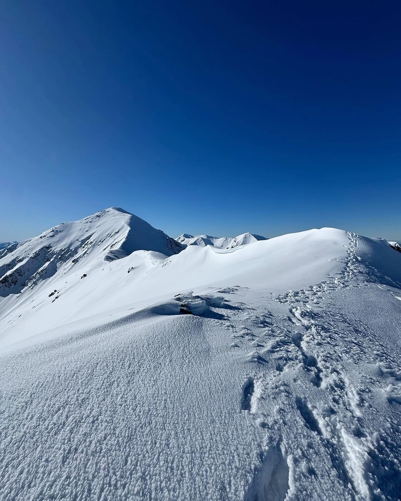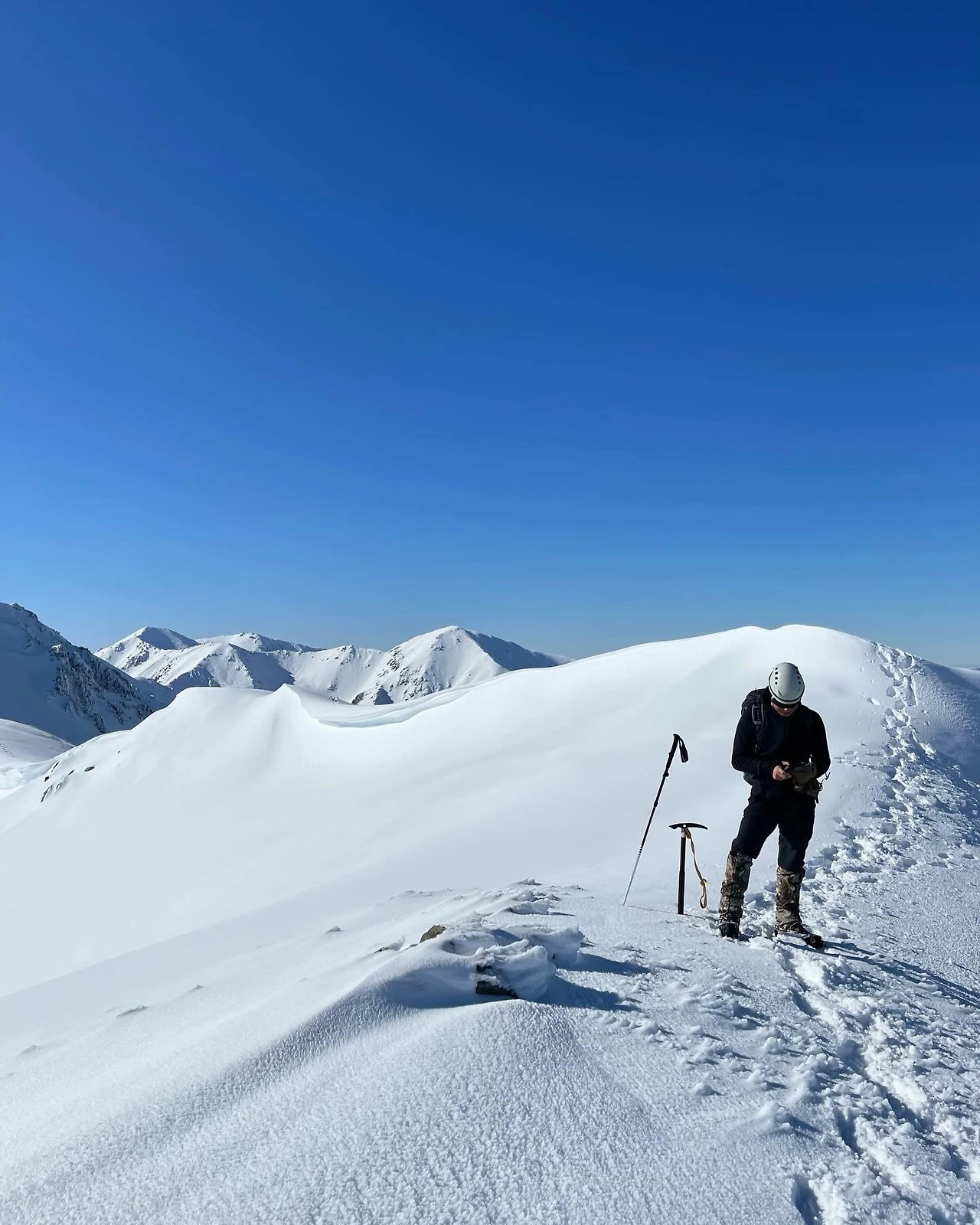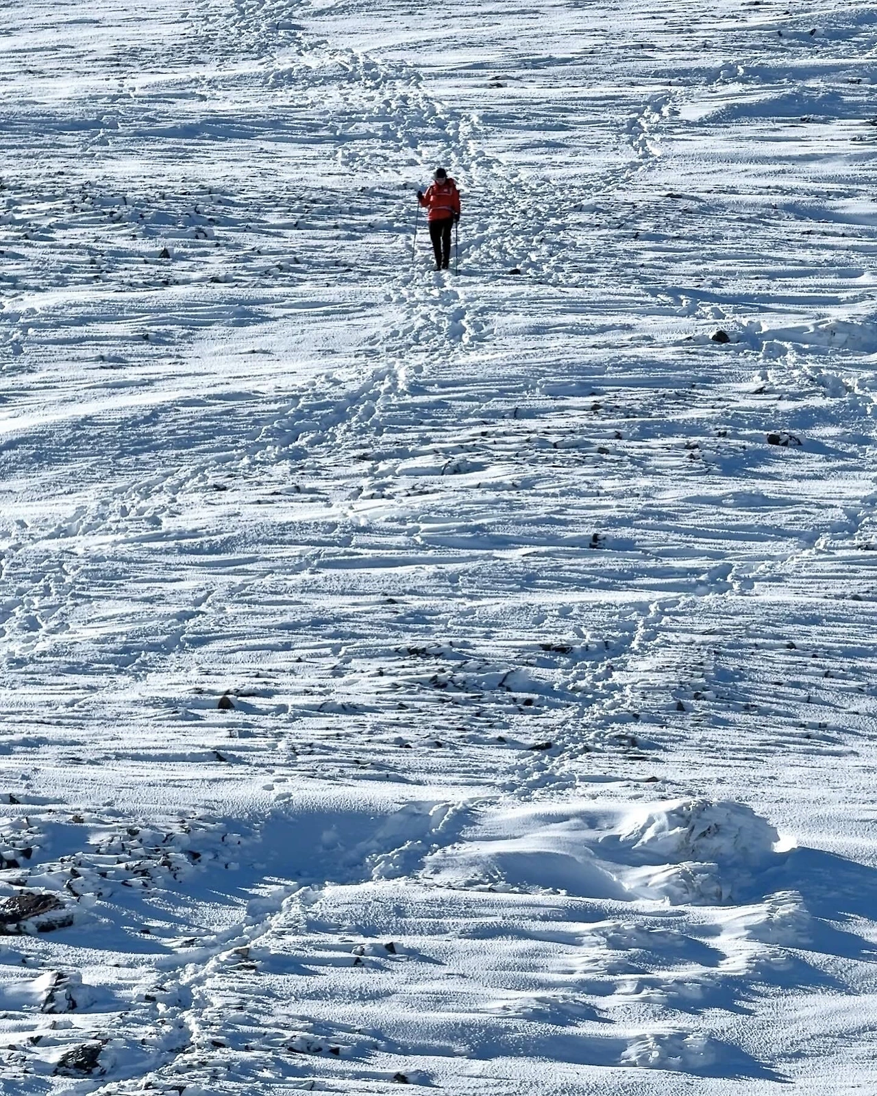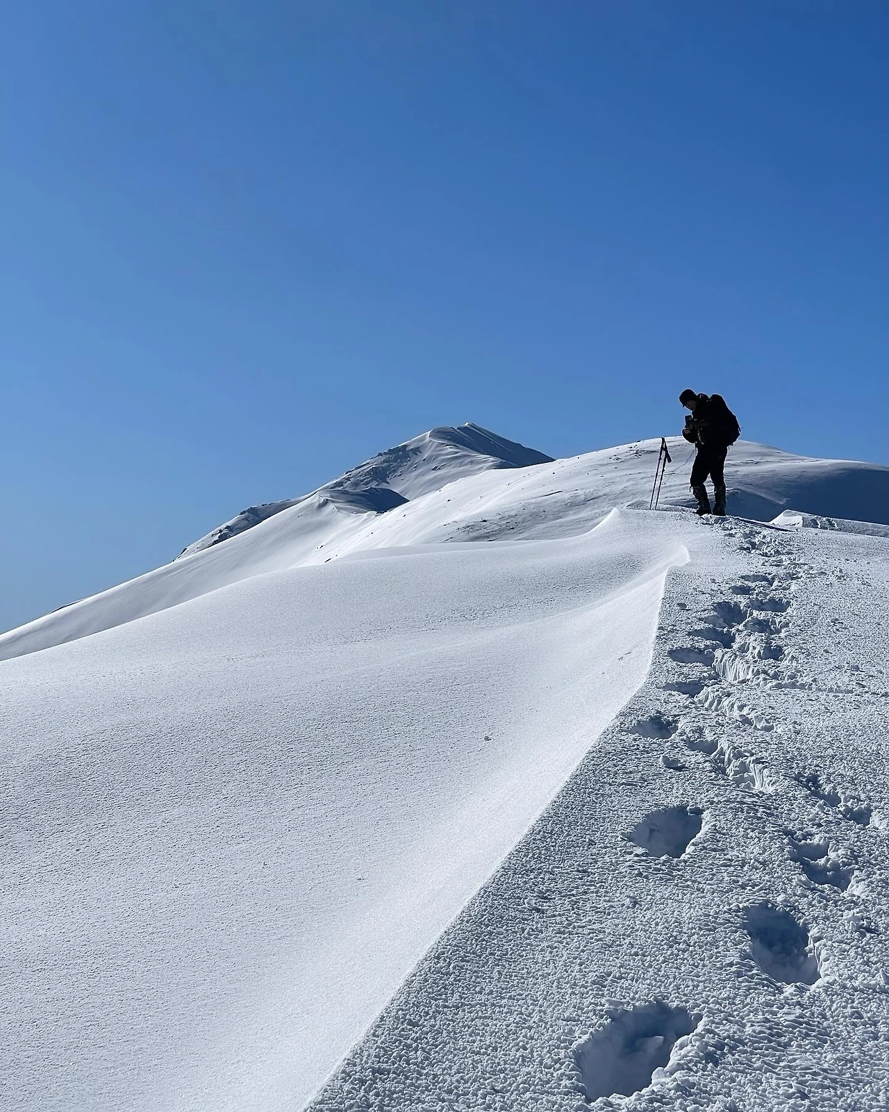 한 가지 산행 전 바꾼 계획이 있었다. 시간이 지체되는 상황을 최대한 줄이려 행동식으로 하기로 하고 모든 간식거리들을 소분해서 나눠 준비했다. 손쉽게 걸으며 꺼내 먹을 수 있도록 겉옷 주머니에 넣고 중간에 쉬지 않고 걷기로 한 것이다. 그렇게 체력이 고갈되기 전에 수시로 꺼내 먹으며 3시간 만에 포기 피크(foggy peak)에 도달했다. 시간은 11시 30분이었고 정상까지는 아직 여유 있는 시간이어서 곧바로 정상을 향해 전진했다. 급하강 길을 내려가 또다시 이어지는 급경사 길을 또 올랐고 지난번 멈췄던 마지막 지점을 지나기 시작했다. 바로 그때, 그동안에 지나쳐왔던 산행은 빙산의 일각이었던가! 진정한 겨울 등반은 이제부터였다. 잡지책에서만 봤던 거대한 알파인 등반 뷰가 코앞에 펼쳐졌다. 믿을 수 없는 환상적인 겨울산과 마주하던 순간이었다. 새하얀 백설기 같은 눈이 뒤덮인 깎아지른 듯 한 산맥들 사이를 걷는 기분은 마치 히말라야 등반을 하는 착각이 들만큼 살벌함과 동시에 아드레날린이 폭발하는 듯 이루 말할 수 없는 감정에 사로잡혔다. 강한 바람으로 만들어진 아름다운 곡선의 눈 덮인 능선은 보는 것만으로도 감동과 희열감에 벅차올랐다. 이것이 과연 실제란 말인가! 꿈같은 현실에 손가락으로 볼이라도 꼬집어 보고 싶은 심정이었다. 세차게 불어오는 바람은 잠깐의 감상을 끝내게 만들었고 곧바로 긴장감이 감돌며 정신을 똑바로 차리고 온몸에 힘을 실어 걸었다. 절벽에 다다르기 시작했을 때쯤 서서히 몰려오는 살벌함에 오른쪽 경사면은 아예 쳐다도 볼 수 없었다. 저만치 앞서 걷던 남편은 쉬면서 지켜봤고 다가가는 나에게 말을 건넸다. 그곳은 마지막 최고의 난이도 구간인 정상을 바로 앞에 둔 마지막 지점이었다.
