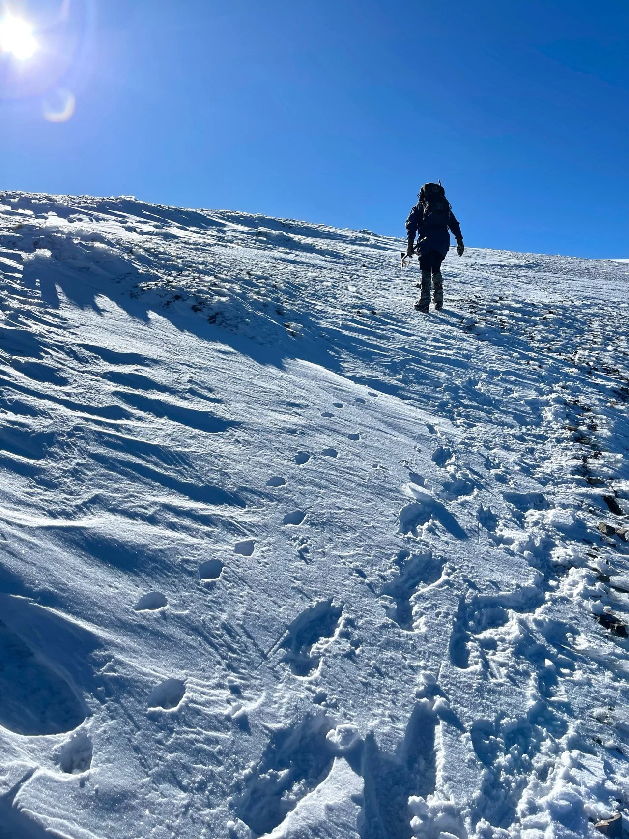 얼어버린 빙판길이나 눈길을 천천히 밟으며 쉬지않고 걸었다. 걸으면서 바라본 오른쪽 능선은 내가 과연 이토록 급한 경사면을 걷고 있는 게 맞는가라는 착각에 빠질만큼 비현실적인 풍광과 마주했다. 그 순간 아드레날린이 뿜어져 나오며 말로 표현할 수 없는 쾌감에 사로잡혔다.