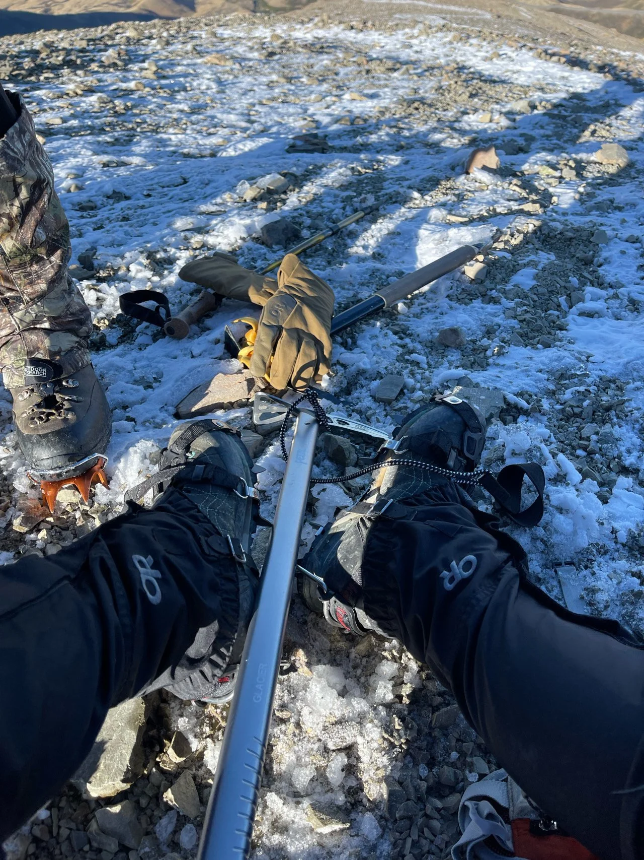 차에 내리자마자 강하고 차가운 바람이 맞이했다. 재빠르게 모자를 쓰고 장갑을 끼고 커다란 가방을 메고 걷기 시작했다. 주차장에서부터 시작된 가파른 길은 온통 크고 작은 돌들이 깔려있다. 욕심을 내려놓고 가장 안전한 페이스를 유지하며 중간 지점인 1500m에서 잠시 쉬며 간식을 챙겨먹었다. 눈 앞에 펼쳐진 광대한 산맥들과 그 사이로 커다란 린든호수(Lake Lyndon)가 압도한다. 보통 이 곳에서 자신의 컨디션 상태나 날씨 상태를 고려해 산행 여부를 결정한다고 한다. 쾌적하고 맑은 날에 바람도 생각보다 강하지않아 우리는 계속해서 목적지를 향해 가기로 했다. 잠시 몸에 열량을 보충하고 또다시 경사길을 오르기 시작했다. 걷다보니 눈이 쌓인 지점에 다다라 가던 길을 멈추고 가방을 내려 크램폰(아이젠)을 꺼내 신고 게이터(스패츠)도 착용하기 시작했다. 떠나기 전 집에서 연습삼아 착용해보았으나 세찬 바람에 장갑을 끼고서는 제대로 되지않아 맨 손으로 착용을 해야했고 생각보다 꽤나 시간을 지체하게 만들었다. 제대로 단단히 하지않으면 오히려 커다란 낭패를 볼 거란 걸 알기에 마음을 느긋하게 먹기로 하고 차분히 시행해 나갔다. 그렇게 난생 처음 등산화 위에 크렘폰을 착용하고 헬멧을 쓰고 오른손에는 아이스 액스를 들었다. 이것은 내 생전 꿈에도 그려보지않은 아주 낯선 모습이었다.