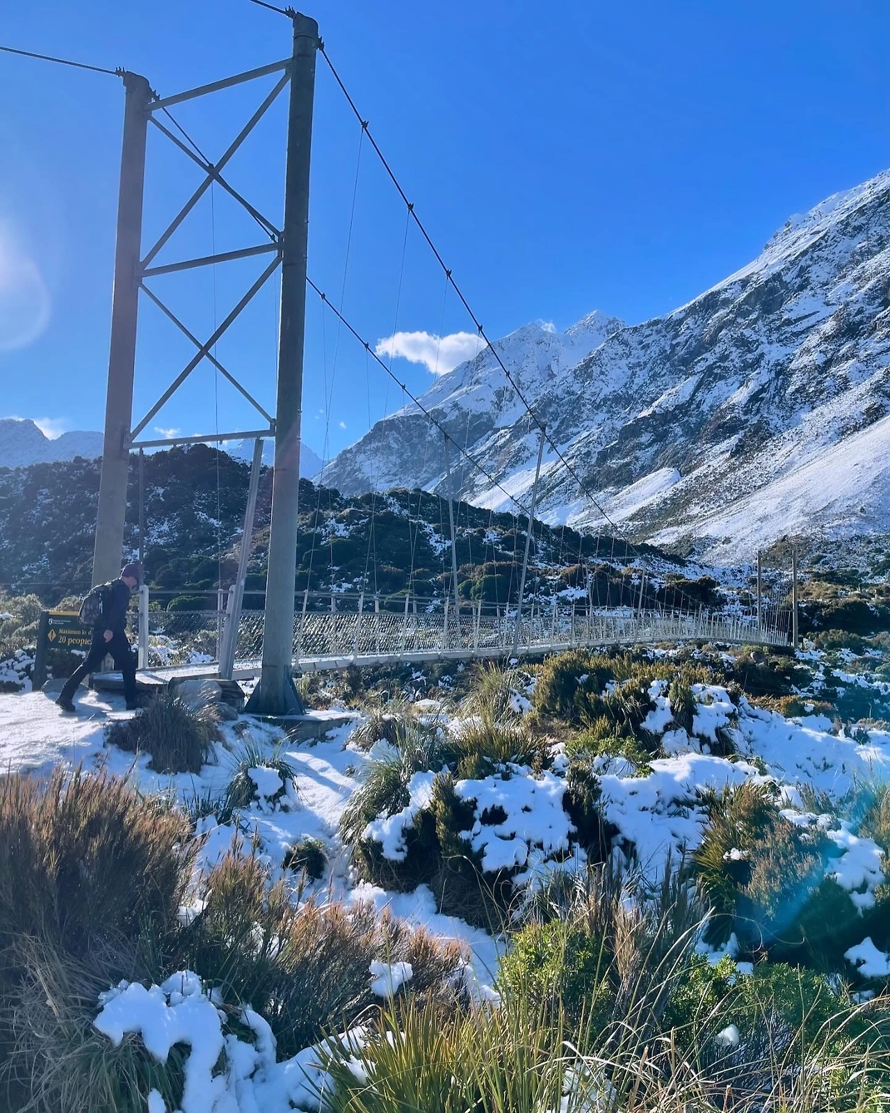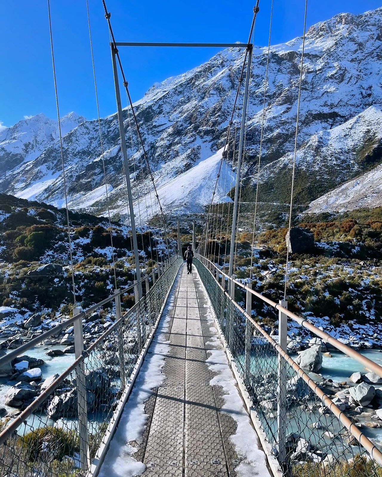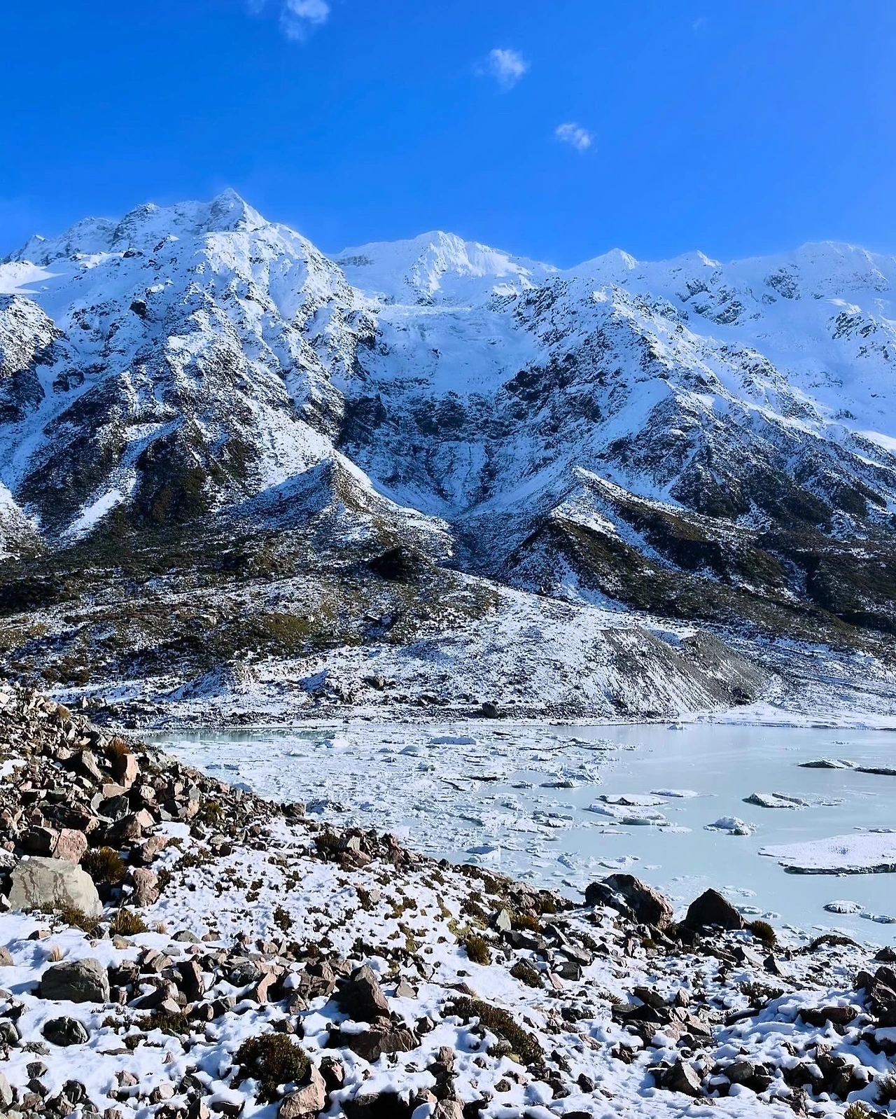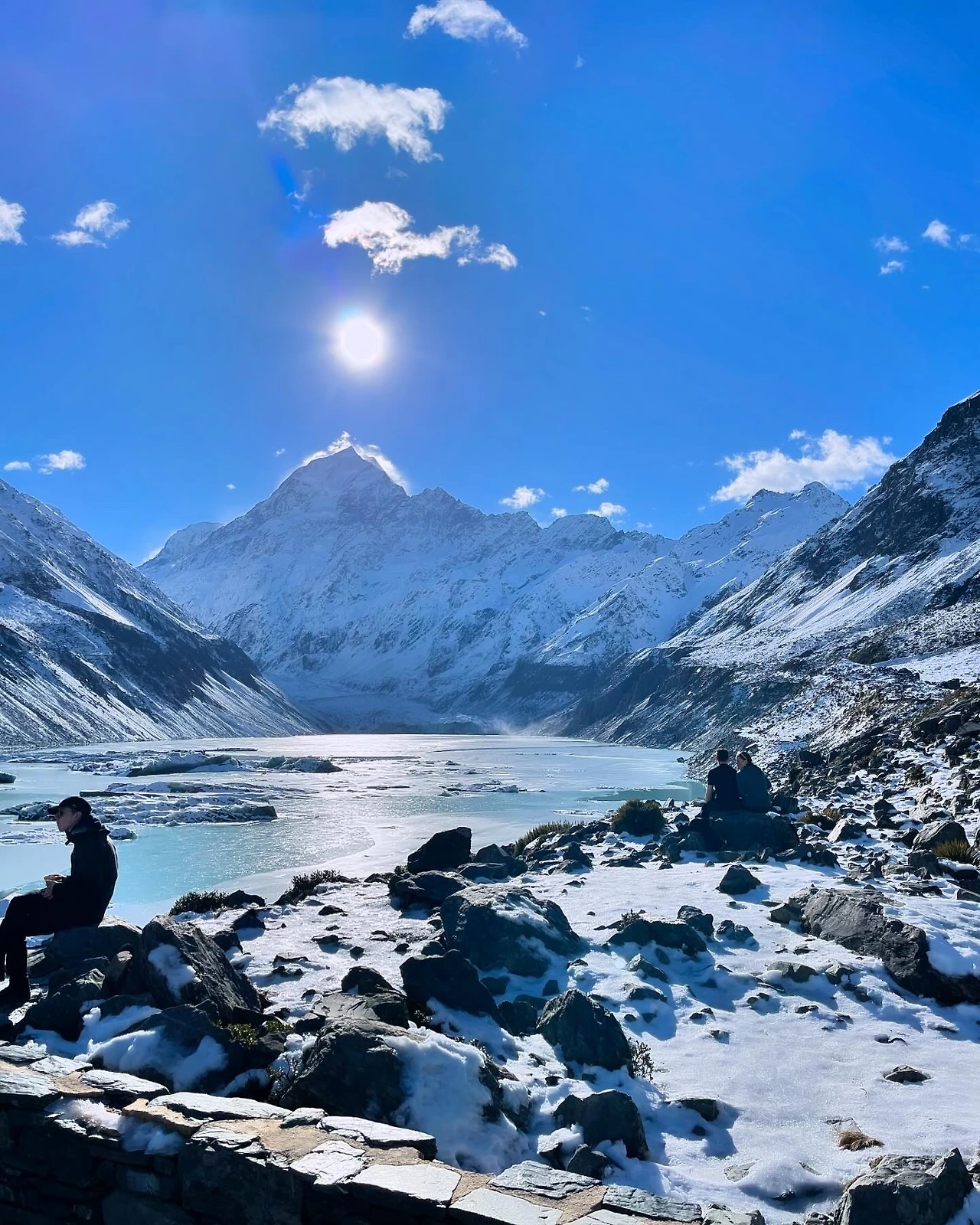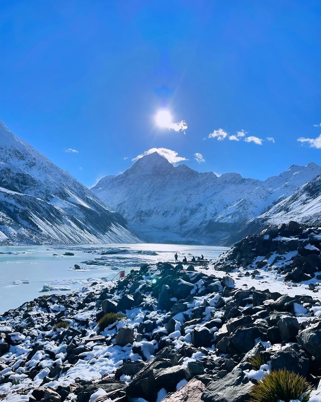오랜만에 걷는 후커 밸리 트랙이었지만, 겨울에 걷는 것은 처음이었다. 걸을 때마다 감탄이 절로 나왔고, 역시 겨울 산행답게 평지였음에도 얼음이 녹지 않아 위험한 길을 잘 살펴가며 걸어야 했다. 아무런 준비 없이 걷던 사람들이 미끄러지거나 겁에 질려하는 모습도 종종 목격했다. 다행히 일찍 출발한 덕분에 사람들의 오고가는 길목에서 번잡함 없이 목적지에 도달했다. 첫째 날보다 따뜻한 기온에 이른 아침에 썼던 비니와 겉자켓도 벗고 상쾌한 아침 공기를 듬뿍 마시며 걸었다. 그 기분은 말로 표현할 수 없을 만큼의 최고의 신선함이었다. 운 좋게도 맑은 날씨 덕분에 칼로 자른 듯한 날카롭고 뾰족하게 솟아있는 마운트 쿡 정상을 아주 선명하게 볼 수 있었고, 그 웅장함 앞에 자연스레 숙연해지던 순간을 마주했다. 빙하들이 떠 있는 고대 풍경 속을 한참 감상하며 약간의 출출함을 너트바 하나로 달래고, 다시 되돌아가기 위해 출발하려 할 때쯤, 저 멀리서 사람들이 벌떼처럼 몰려오기 시작했다.