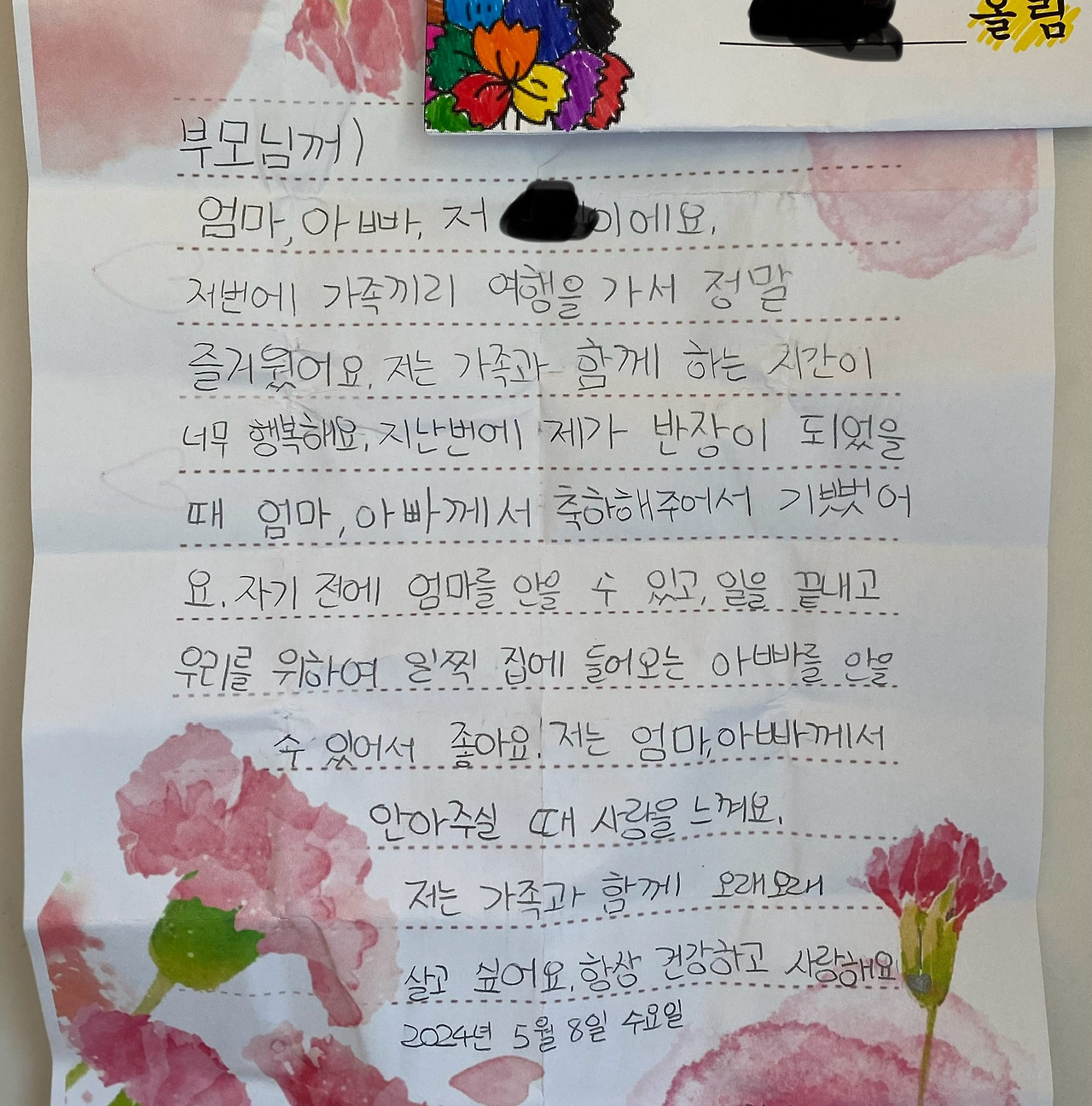 작은 아이는 어버이날 아침, 전날 학교에서 만든 작은 카네이션과 편지를 들고 온다. 아이의 편지에 눈물이 핑 돈다.