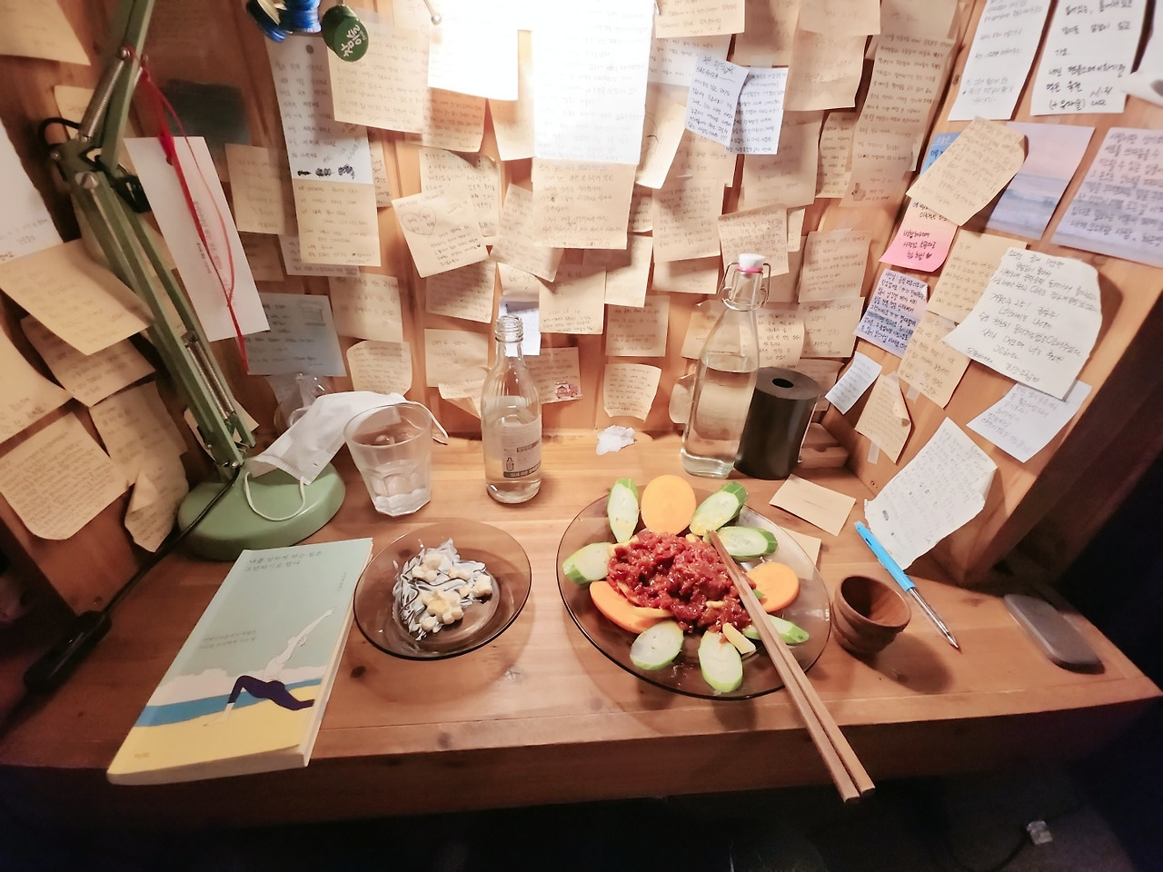 벽에 붙어 있는 포스트잇, 독서실? 작업실?에서 술 마시고 있는 듯한 미친 감성. 혼술집 3인방 (처음 만남). 다음날 같이 물곰탕 해장도 했음. 이런게 혼행의 묘미이지 않을까?