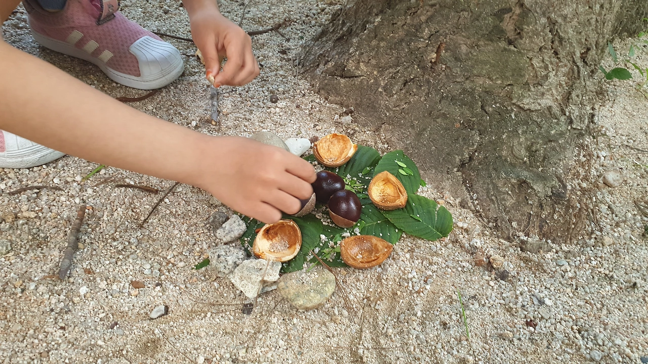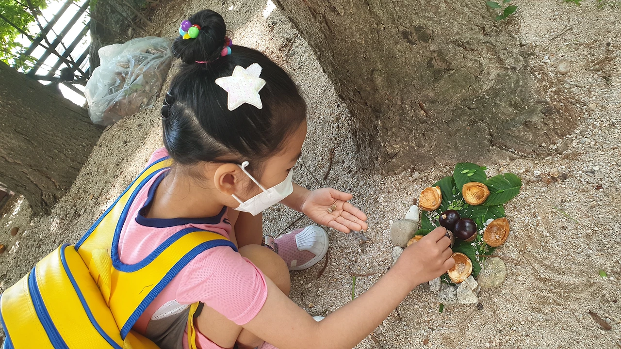 나뭇잎 위에 열매 껍데기로 의자를 만들고 돌멩이며 흙으로 꾸며 주는 여니 옆에서