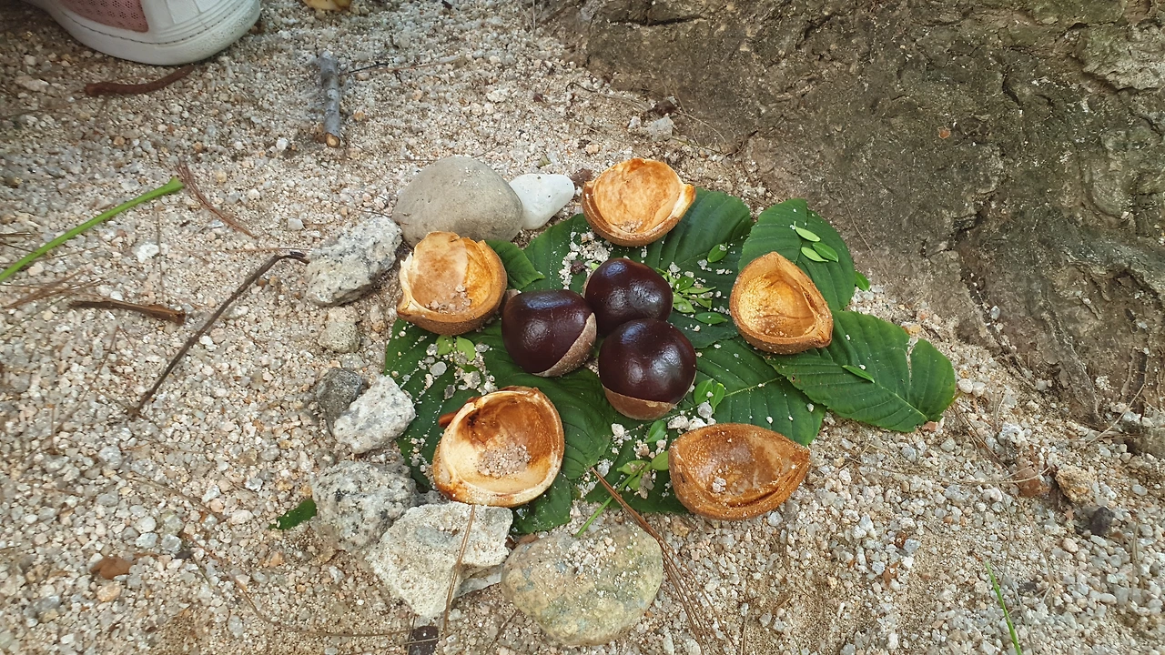 나무에서 떨어진 열매 껍데기를 보며 말합니다.