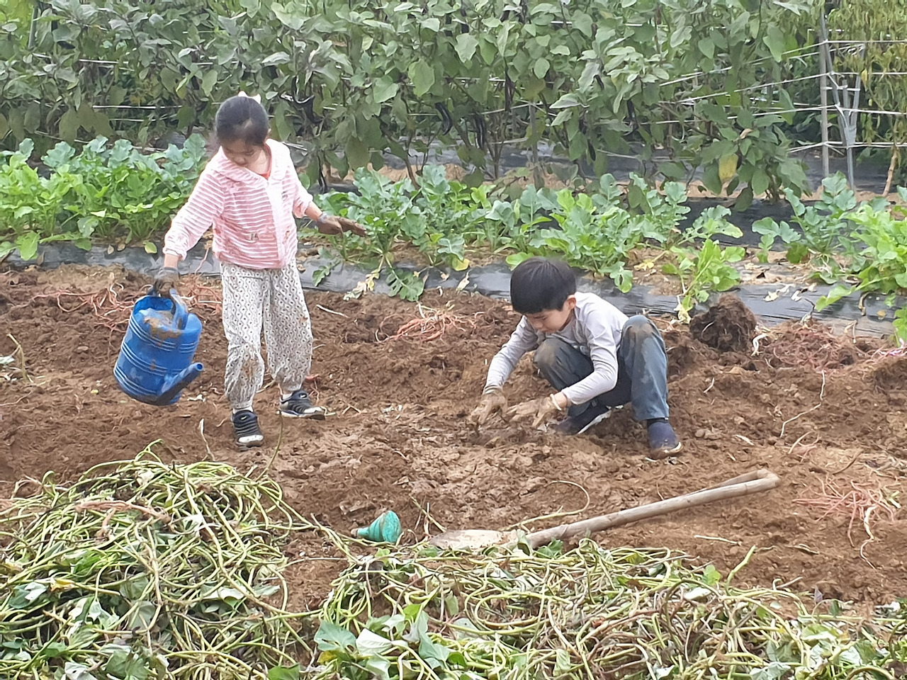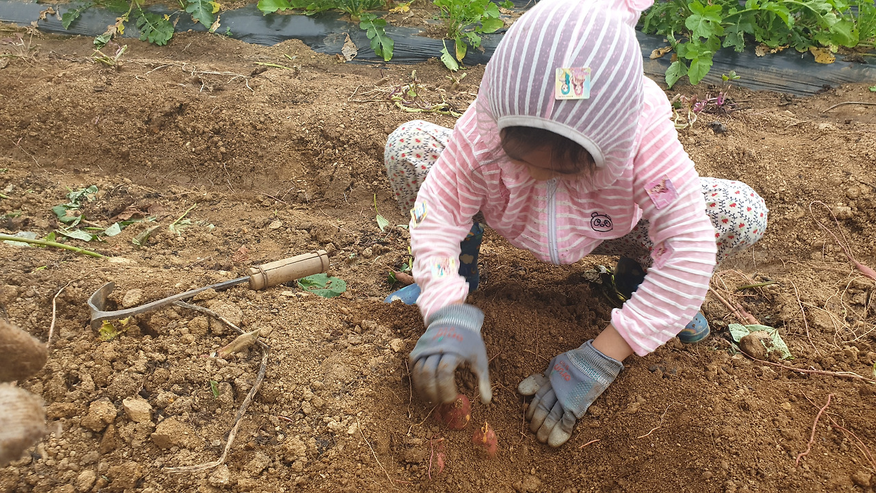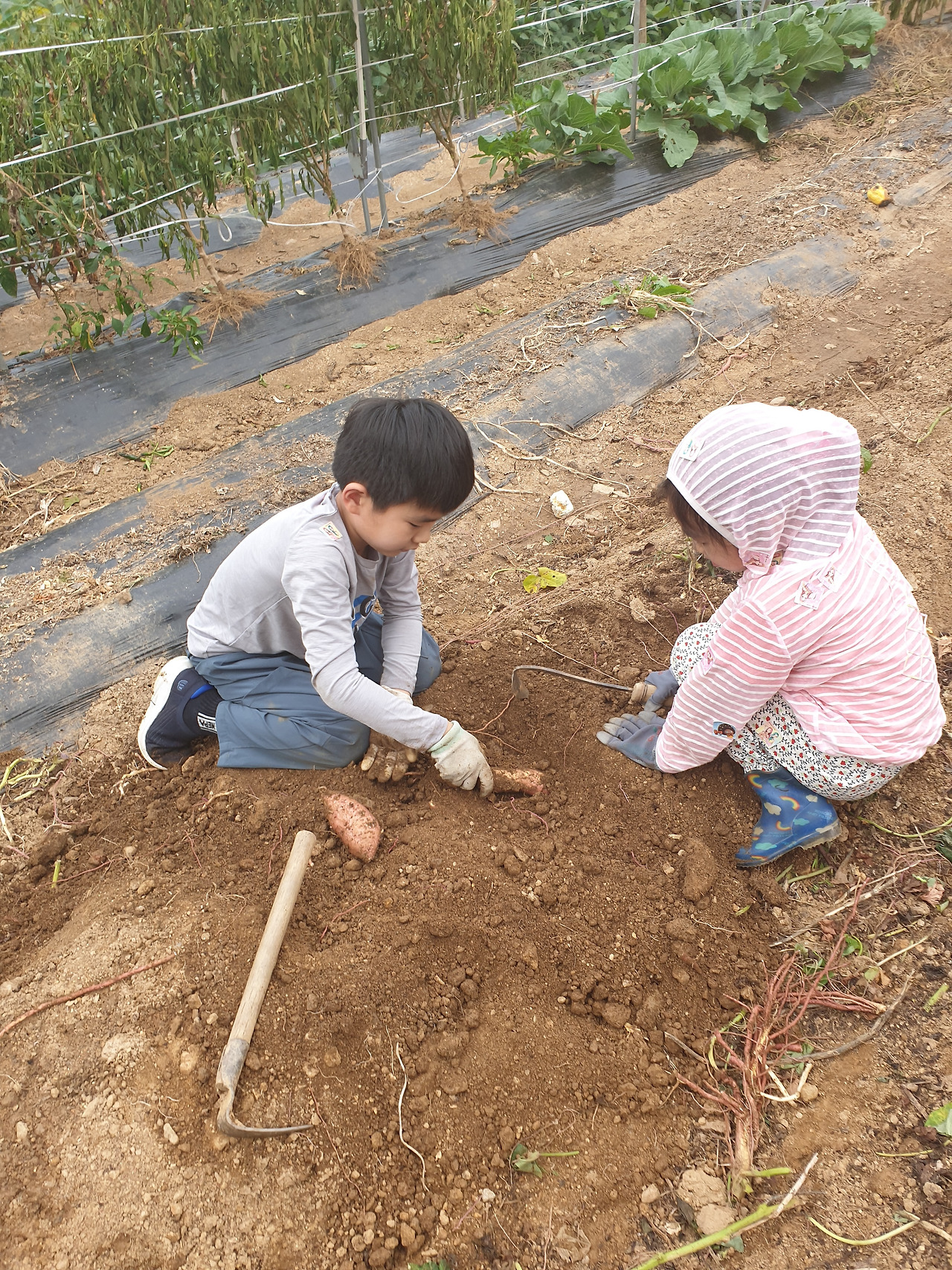 커다란 고구마가 나오자 신이 난 아이들은 열심히 고구마를 캐봅니다.