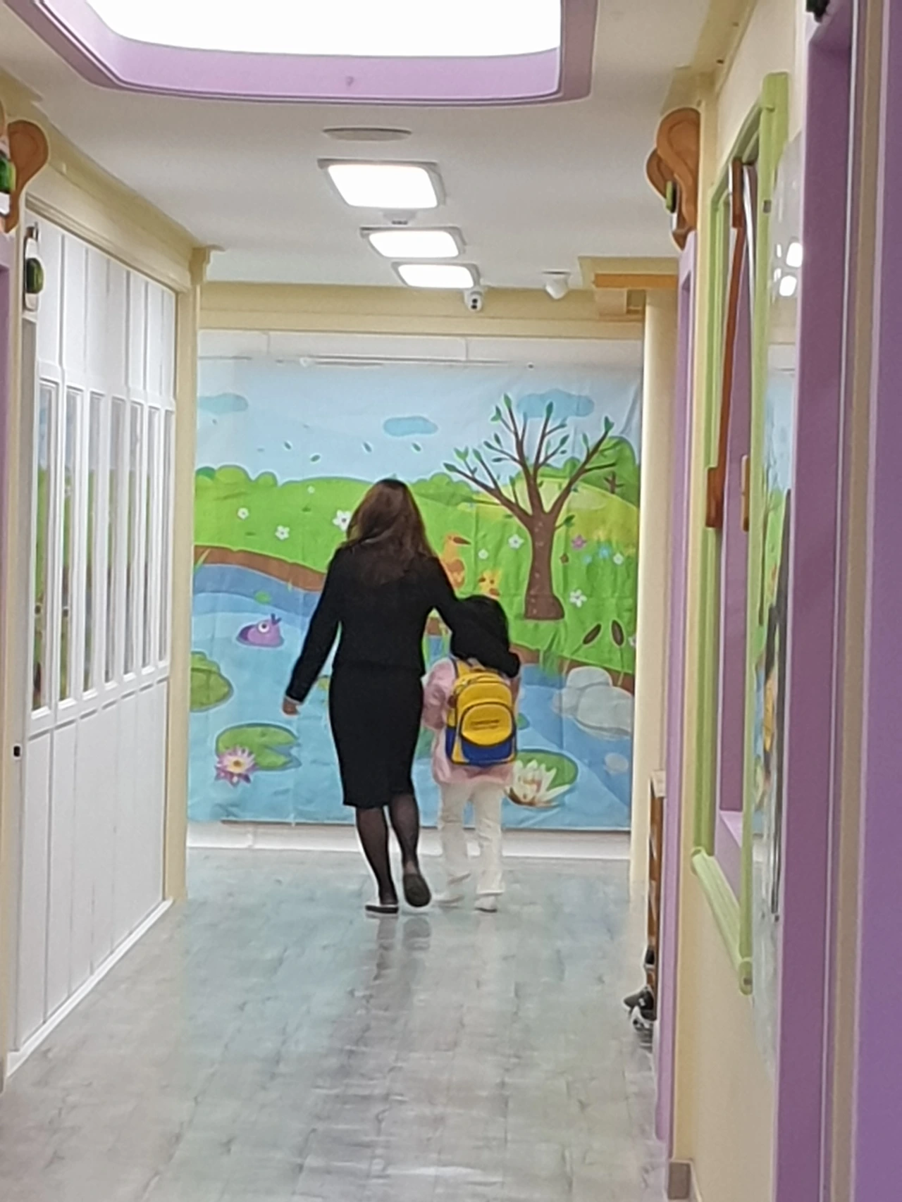 뒤돌아 선생님과 교실로 들어가는 모습에