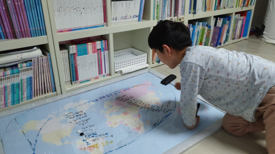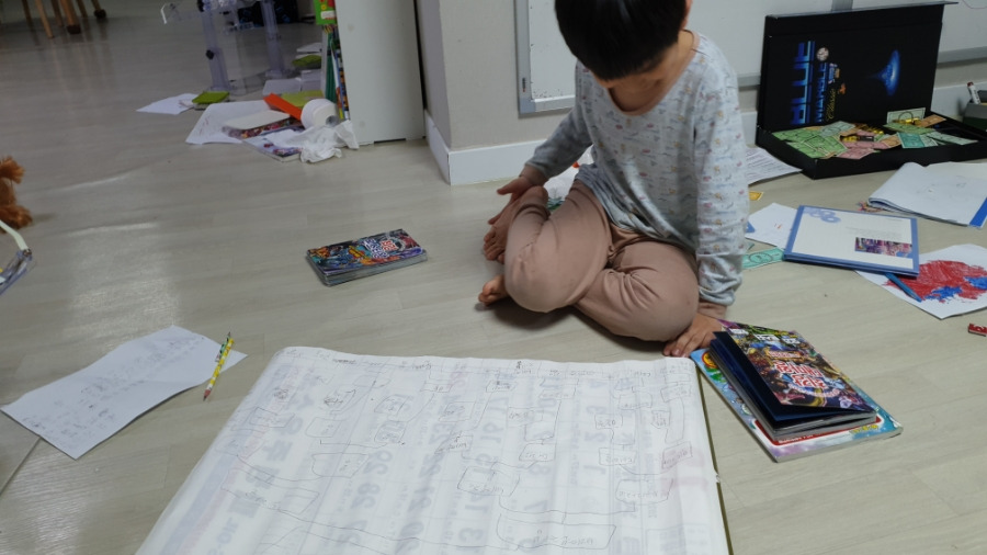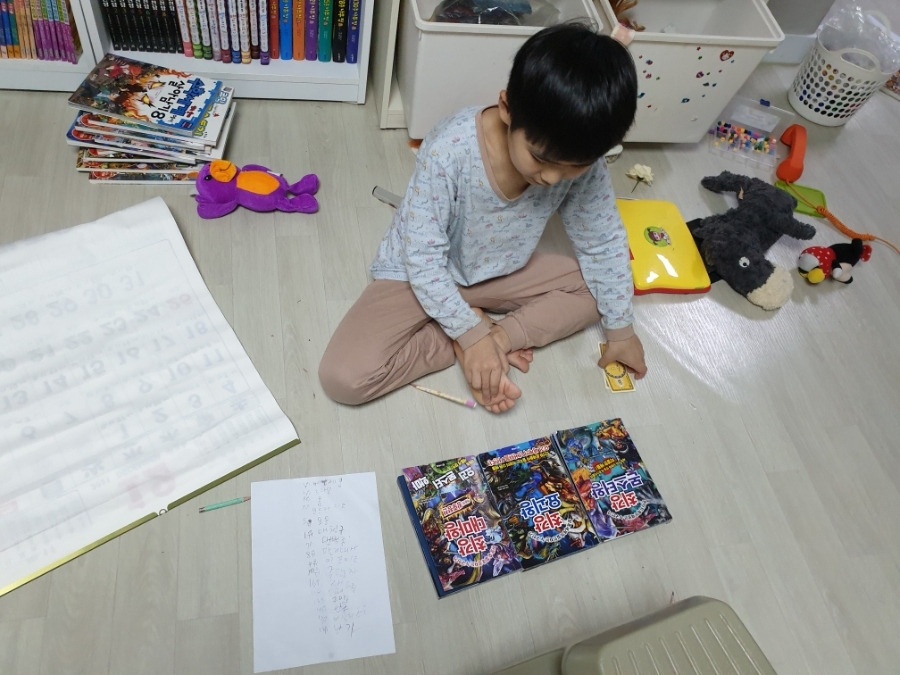 종이를 피고 앉아서요.