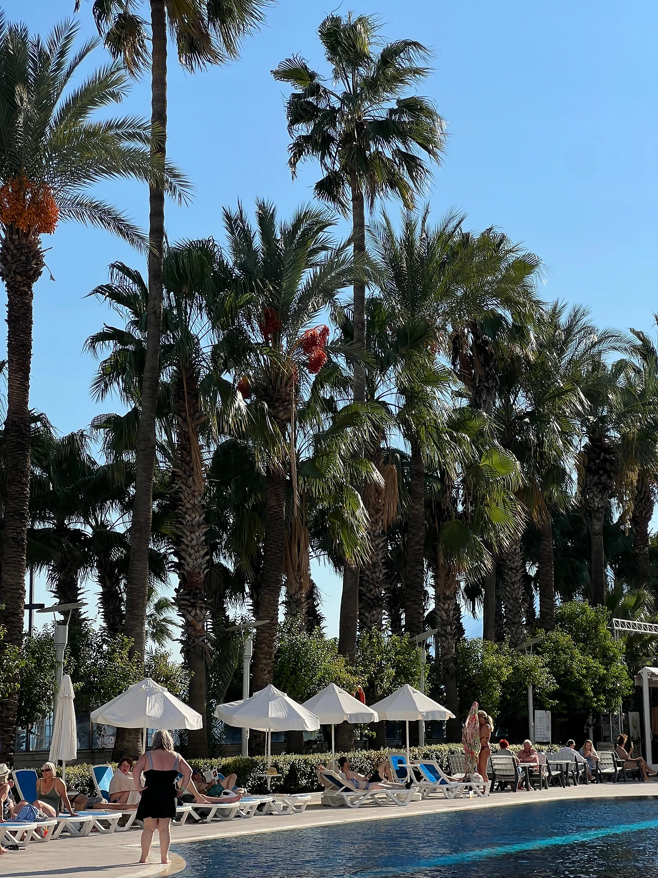 안탈리아의 파란 하늘과 흰빛의 우람한 돌산, 그리고 도시 전경을 감상하며 포르토 벨로 리조트까지 약 30분가량 드라이브했다. 리조트에 도착하자마자 또 한 번 탄성이 터져 나왔다. 주차장까지만 해도 평범한 도심 속 리조트인 줄 알았는데, 리조트 안으로 들어서자마자 완전히 다른 세상이 펼쳐졌다. 이국적인 풍경, 오랜만에 느껴보는 유럽식 휴양지의 분위기. 기분이 단숨에 밝아졌다. 호텔 로비의 나이가 지긋한 할아버지 직원 분이 손목에 팔찌를 채워주셨다. 올인클루시브 호텔이라 이 팔찌만 있으면 리조트에선 먹는 것도, 마시는 것도 모두 자유롭다. 이틀만 머물 예정이지만, 그동안 만이라도 진짜 휴가다운 휴가를 즐겨보자.