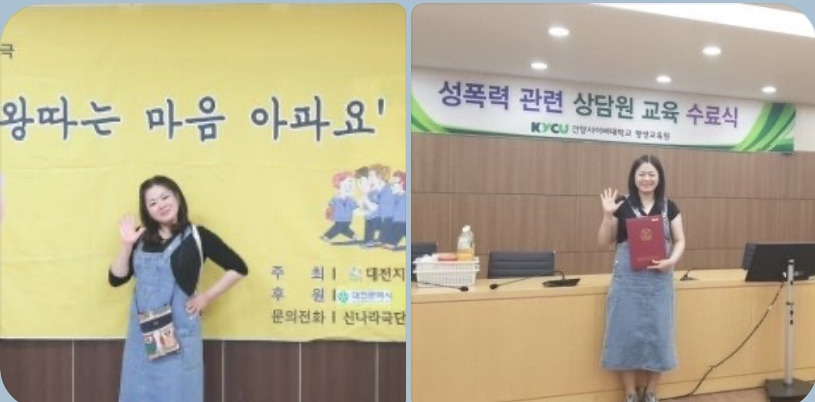또한 모든 폭력사태에 있어 내가 피해자가 되지 않기 위해 노력하기보다 내가 가해자는 아닌지? 돌아보는 일이 많아졌다. 이는 나에게 학교폭력 예방 지도사와 성폭력 예방 교육 강사로 활동하게 했다.