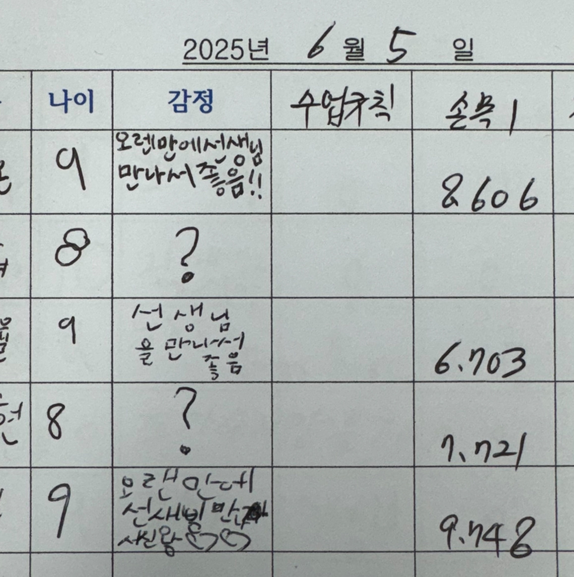 * 지난주 수업 한번 빠졌다고 학생들이 출석부에