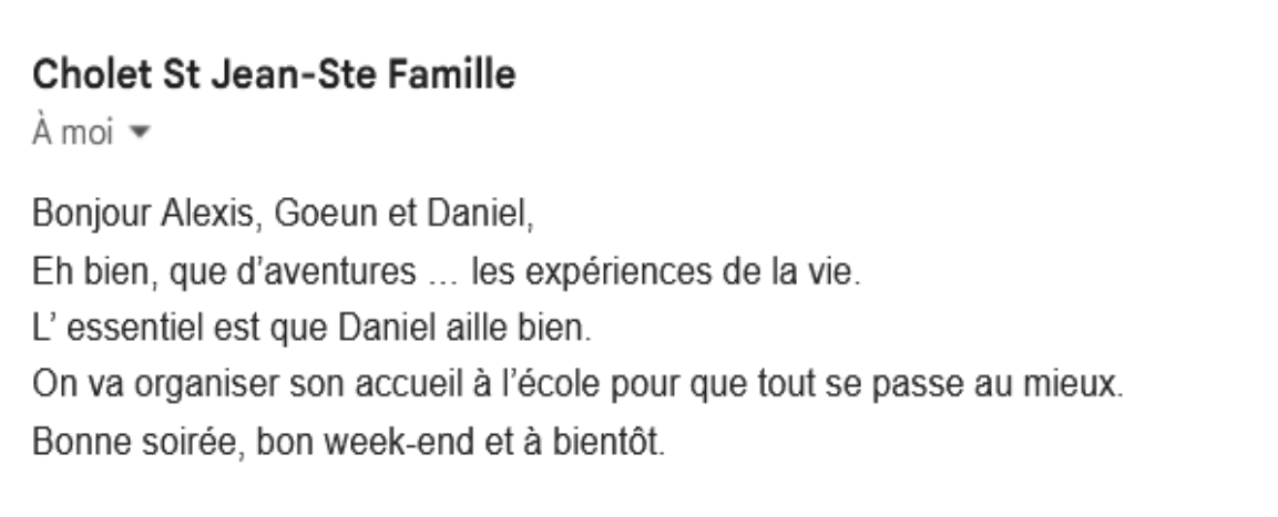 그래서 개학이 되기 전 우리는 다니엘 학교의 교장선생님과 다니엘 담임선생님에게 이메일을 보냈다.