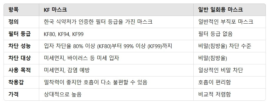 일반 일회용 마스크 : 기본적인 침방울(비말) 차단이 주목적. KF 인증이 없는 경우가 많고, 특정 입자에 대한 차단 성능이 명확히 규정되어 있지 않다.