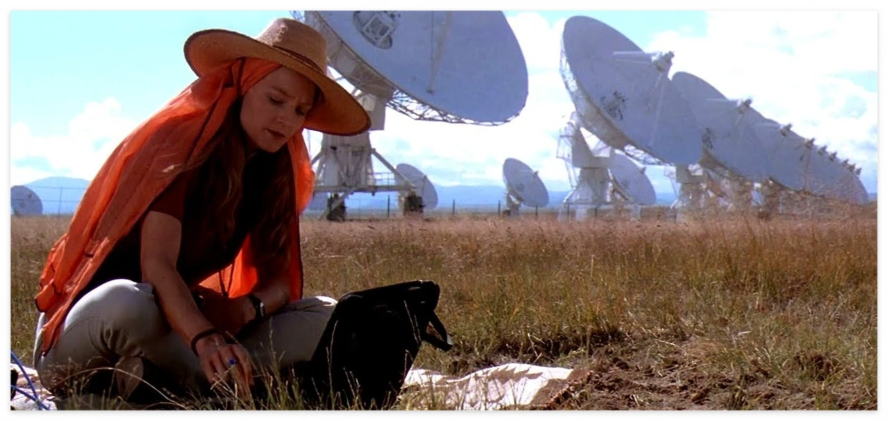 그렇게 희망의 불빛이 꺼져가던 무렵, 결국 엘리는 외계로부터의 전파 메시지를 수신합니다. 전 세계는 그 소식에 주목하고 그녀는 역사상 가장 중요한 임무와 대면합니다. 전파 메시지에 담겨 있던 것은 매우 정교한 설계도였습니다. 그 설계도는 웜홀(이론 속, 가상의 천체)을 활용한 '텔레포트 장치'를 담고 있었고, 탑승할 기회는 엘리에게 주어지는 듯 했습니다. 그러나, 끝내 신과 종교를 믿지 않았던 엘리는 인류를 대표할 자격을 박탈 당하게 됩니다. 그녀는 과학을 믿으며 미지의 존재와의 만남을 꿈꾸었지만, 끝내 종교와 사랑의 힘은 부정합니다.