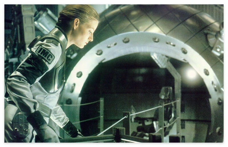 결국 여러 우연과 역경을 이겨낸 끝에 엘리는 텔레포트 장치에 탑승하게 됩니다. 그 순간 웜홀을 통해 먼 우주로 이동하는 장면의 연출은, 세월이 흐른 지금에도 감탄을 자아낼만큼 아름답습니다. 이와 유사한 장면이 <인터스텔라, 2014>에 등장하는 것은 우연의 일치가 아닐겁니다. 오늘날 SF 장르의 수많은 작품들이 이 영화의 여러 설정과 장면을 오마쥬하기 때문입니다. 이제부터 소개할 장면은 작품의 가장 중요한 '주제의식'을 담고 있습니다.