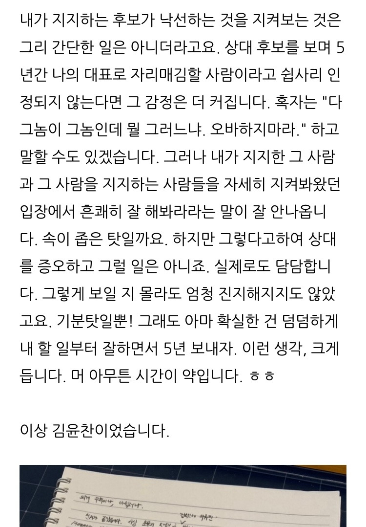 나는 우리가 정치를 잘 모르고 생각이 달라도 같은 사람으로서 통하는 것이 있다고 믿는다. 나는 이태원 참사로 가족을 잃은 보통의 사람들에게 영정 없는 분향소를 설치한 끔찍한 정부를 가만 두고 볼 수 없다. 나는 본인의 무지함을 자각하지 못하는 무지한 대통령을 가만 두고 볼 수 없다. 나는 대통령과 정부에 비판적인 언론을 검열하고 통제하는 무도한 정부를 가만 두고 볼 수 없다. 나는 법무부장관을 거치고도 정부에 대한 본인의 책임은 없다는 무책임한 집권 여당의 비상대책위원장을 가만 두고 볼 수 없다. 그들을 결정하는 것은 말이 아닌 그들의 행동이다. 그들은 그들의 이권에 관련된 일에는 사사롭고 비겁한 행동을 일삼았고 가슴을 잃은 이들에게는 시큰둥한 표정을 지어왔다. 이번 선거에서 그들에게 마땅히 주어져야 하는 것은 주권자의 싸늘한 반응이리라 굳게 믿는다.