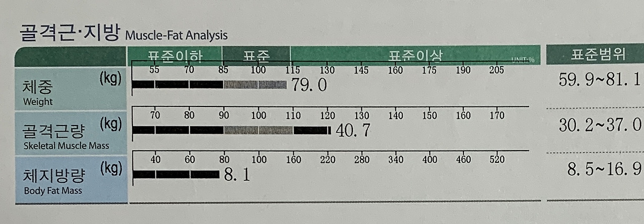 1년 전 운동량은 지금과 비슷하지만 잠들기 전까지 탄수화물(빵)을 꾸준히 먹었던 적이 있었다. 근육량은 그대로인데 지방량이 많이 늘어서 인바디 결과가 좋지 않게 나온 적이 있었다. 알고는 있지만 실천하기 어려운 과제인 만큼, 운동의 효과가 상쇄되지 않도록 식습관 관리를 항상 하기를 권한다.