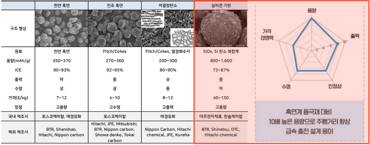기존에는 이차전지용 음극재로 천연흑연, 인조흑연 및 저결정 탄소 등 주로 흑연계 소재가 사용되었으나, 전기자동차용 이차전지 시장이 급격히 확대됨에 따라 고용량 및 고속 충전을 위한 새로운 음극 소재에 대한 수요가 증가하고 있는데, 그 대표적인 소재가 실리콘계(Si계) 음극재입니다.