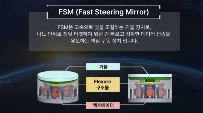 FSM(Fast Steering Mirror)은 쉽게 표현하면 반사거울입니다. 인공위성들이 데이터를 더 빠르고 정확하게 주고받을 수 있도록 해줍니다. 광통신을 위해서는 빛(레이저)의 각도를 얼마나 미세하게 조정하고, 정확하게 제어하는지가 핵심인데, FSM이 반사 거울을 이용해 광학적인 빛의 방향을 정밀하게 조절해 줍니다. 고속으로 빛을 조절해 나노 단위로 정밀 타깃해서 위성 간 빠르고 정확한 데이터 전송을 가능하게 해주는 것이죠.