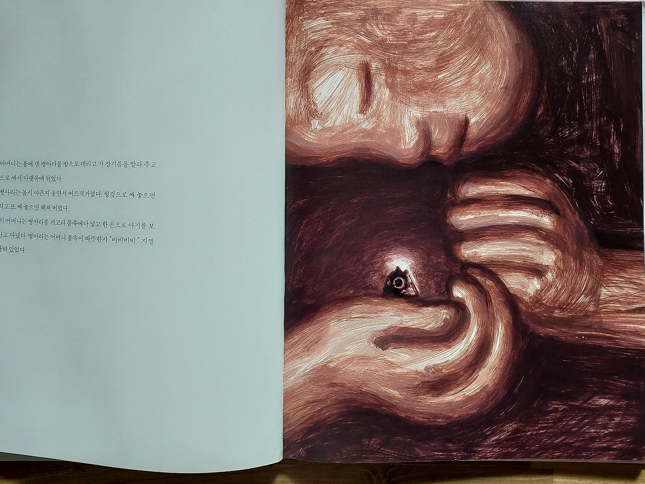 “빼떽아, 지금 나라에 전쟁이 일어나서 우리는 피난을 가야 한단다. 그래서 너 혼자 두고 갈 수도 없고 데리고 갈 수도 없어 어쩔 수 없이 너를 잡아먹는다. 너도 그 편이 좋겠지?” (p56)