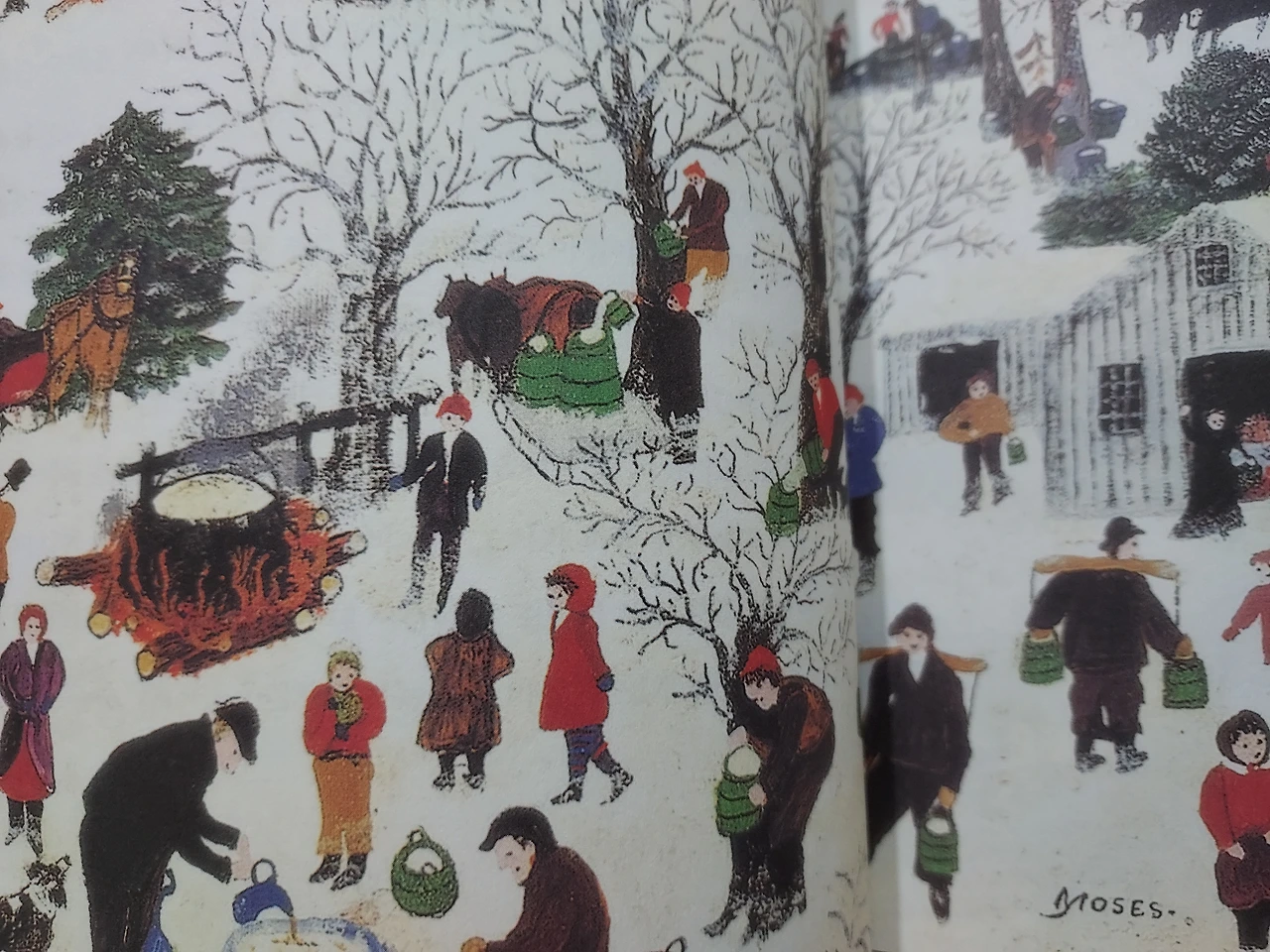 집에서 만들어진 시럽은 다음날 아침 메밀 팬케이크에 원 없이 뿌려먹고 저녁에는 뜨끈한 빵에 또 한가득 뿌려 먹었으니 얼마나 달콤했을까. 달콤한 시럽을 원 없이 먹을 수 있는 시럽 만드는 과정은 아이들에게 놀이요 커다란 즐거움이었을 것이다. 아침마다 아이들은 설레는 마음으로 경쟁하듯이 숲으로 달려가 수액이 얼마나 찼는지 보고 또 자기 수액통을 들고 집으로 향했을 것이다. 어른들은 아이들이 가져온 수액통을 받아 커다란 솥에 넣고 하루종일 졸여 식사 때마다 빵에 달콤한 시럽을 뿌려 먹었을 것이다. 그래서 ‘시럽 만들기’ 그림은 집집마다 집 앞에 커다란 솥을 걸어놓고 수액 통을 이고 옮기는 사람들로 분주한데 흡사 마을 축제처럼 보이기도 한다.