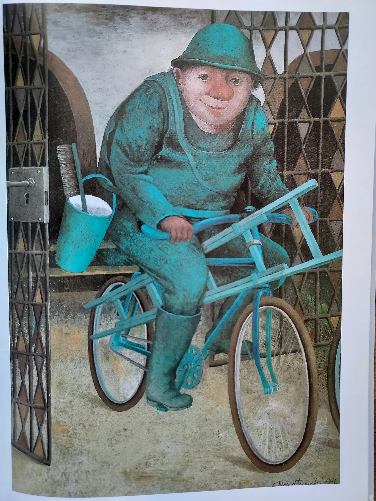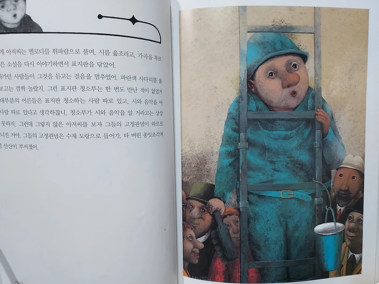 그는 닦아 놓아도 금방 더러워지는 거리의 표지판을 항상 깨끗하게 새것처럼 닦아 놓는다. 아침에 출근해 파란색 자전거를 타고 자신의 구역으로 가 파란색 사다리를 타고 올라가 파란색 솔로 거리의 표지판을 반짝반짝 윤이 나게 닦는다. 청소국 사람들은 자신의 일을 훌륭하게 해 내는 그를 칭찬해 주고 그는 자신의 일을 사랑하고 행복해한다.