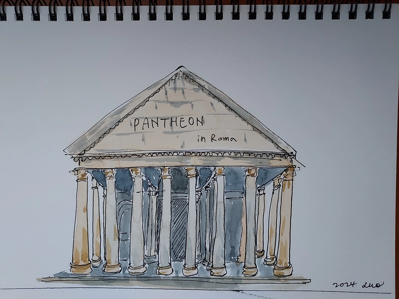 여행을 떠나기 전에 연습 삼아 여행 준비물들 - 여권, 이번에 만든 트래블로그 카드,핸드폰에 저장해 놓기는 했지만 고장과 분실 우려가 있으므로 종이로 프린트 한 예매 티켓들, 여행책들- 을 그려 보았다. 그리고 로마의 콜로세움과 판테온, 나폴리의 플레비시토 광장을 어반스케치 느낌으로 그려 보았다.