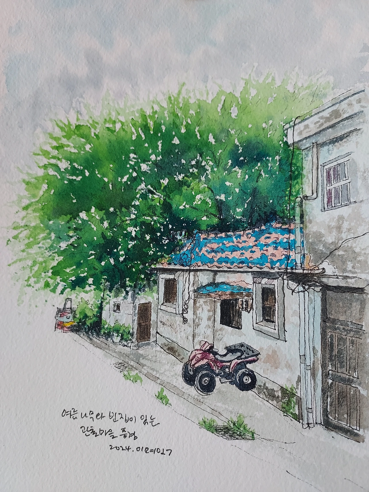 나무의 품에서 비로소 집은 편안해 보입니다. 그렇게 저는 여름나무와 오래된 집을 그림에 담습니다.