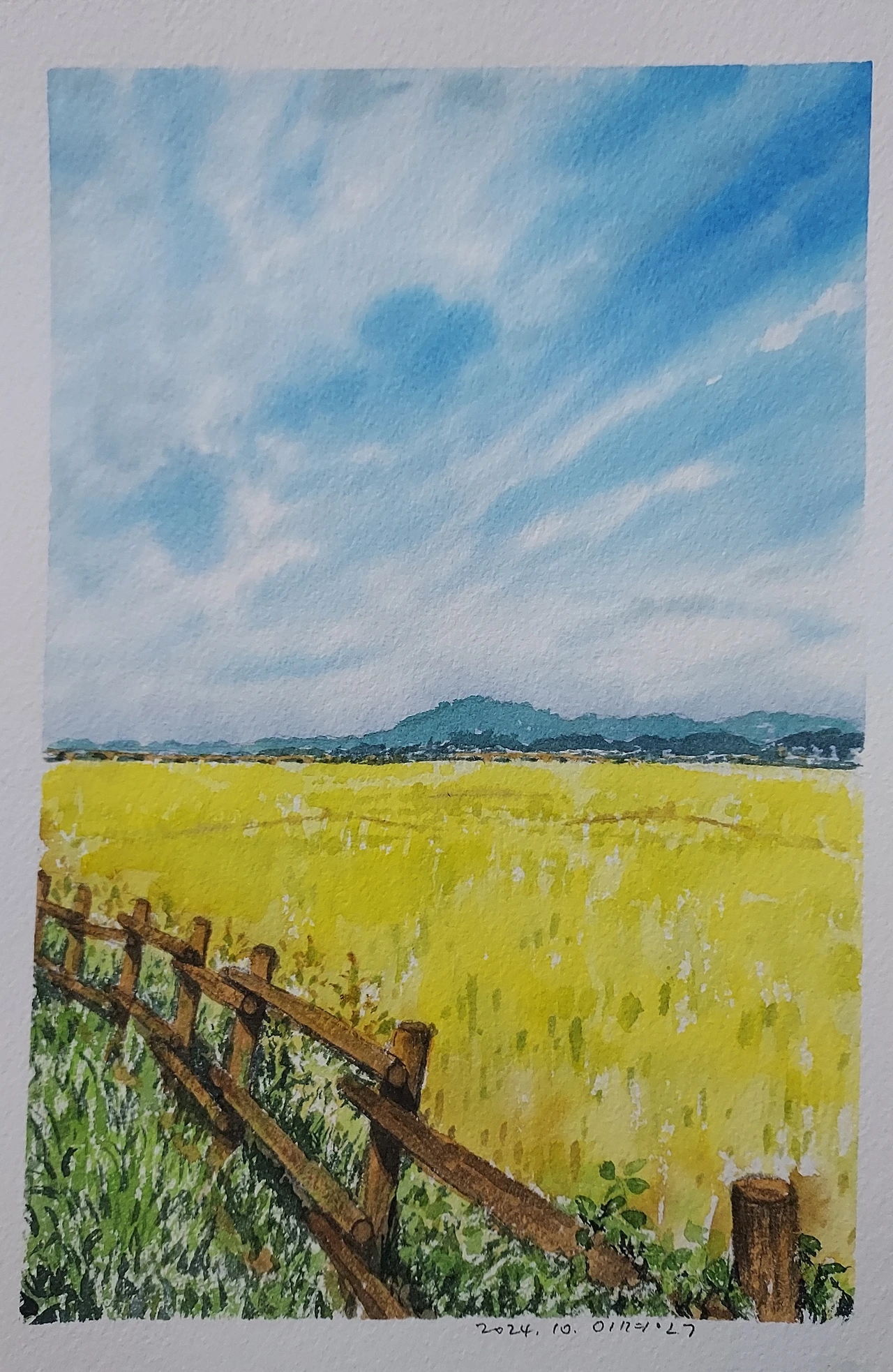 파란 기을 하늘에 흰 구름이 그린 그림, 수확철 황금빛으로 물든 논을 보면서 저는 종이에 수채화로 자연의 색을 흉내 내 봅니다.