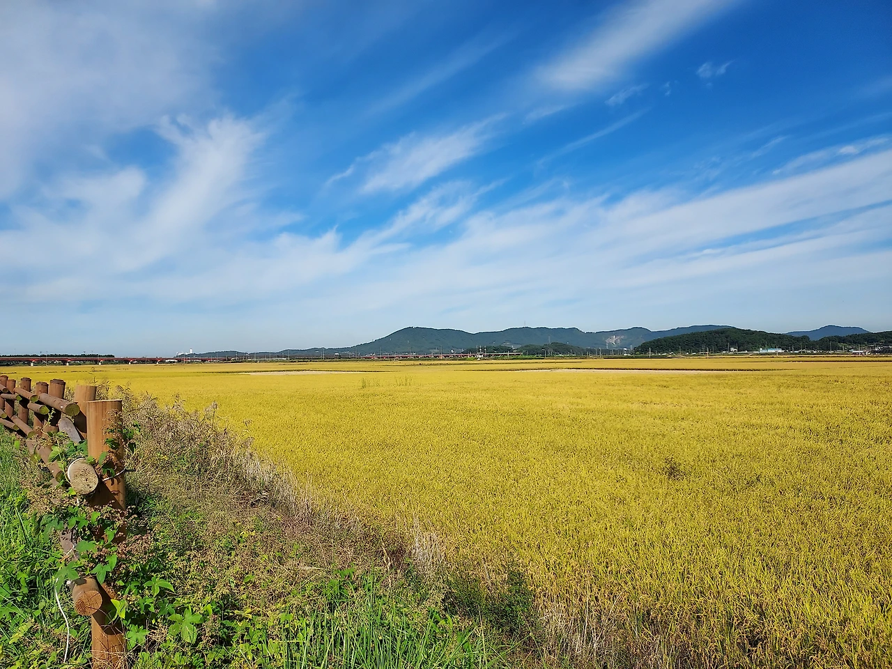 높고 청명한 가을 하늘을 배경으로 노란 물결의 고개 숙인 벼들의 무리는 보고만 있어도 힐링입니다.