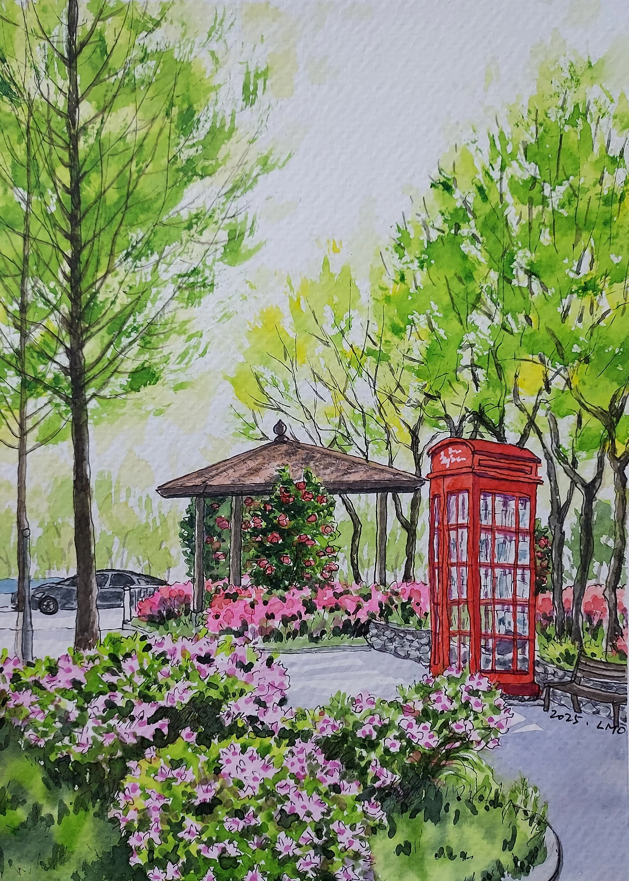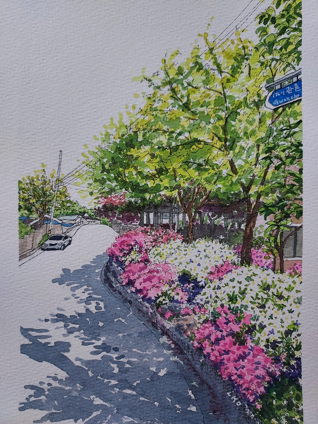 화사한 봄꽃이 전경에 있고 정자와 작은 도서관 박스를 신록이 감싸고 있는 풍경이 마음에 들어와 수채화로 그려 보았습니다.