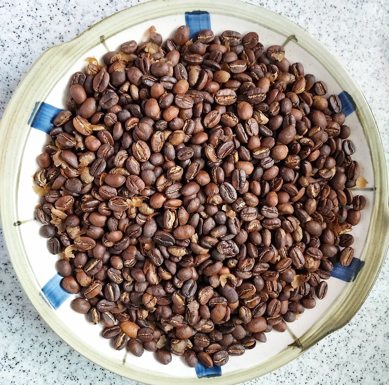 나는 생두를 적당량 덜어 프라이팬에 넣고 로스팅한다. 녹색 빛깔 생두가 갈색이 되고 고동색이 되고 다시 검고동색으로 변하는 과정을 지켜본다. 원두 껍질이 타다닥거리며 벗겨진다. 열을 먹은 원두가 빛깔을 바꾸는 변신과정에서 커피 특유의 고소하면서 세련된 향이 올라온다. 나무주걱으로 20~30분 계속 저어줘야 하는 수고가 들어가지만 커피를 볶는 과정이 재미있다. 생두가 로스팅되면서 빛깔이 변하는 과정을 지켜보는 것도 신기하고 불을 만나 그윽하게 시작해 점점 진한 향을 맡을 수 있는 그 과정도 즐겁다.