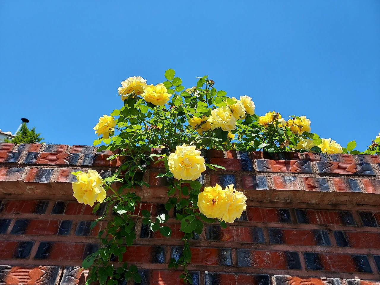 적별돌 담장 위에 노란 장미가 활짝 피었습니다. 우리 동네에서 집밥 같은 음식을 만들어 파는 식당 주인이 마당 있는 넓은 집을 사서 식당으로 꾸몄는데 맛깔스러운 음식만큼 꽃을 가꾸는 데도 열성입니다. 구름 한 점 없는 파란 하늘 아래 빨간 담장을 배경으로 핀 노란 장미는 보는 즐거움이 있습니다.
