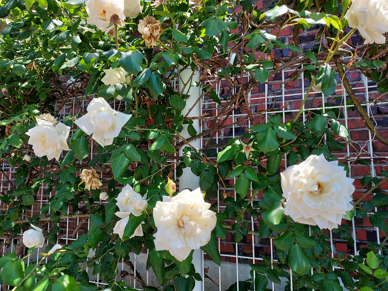 식당 집 울타리 사이사이에 하얀 장미가 활짝 피었습니다. 흰 장미의 꽃말은 순결함, 청순함입니다. 하얀색 꽃잎들이 모여서 모양을 이루어 한 송이 장미꽃이 되었습니다.
