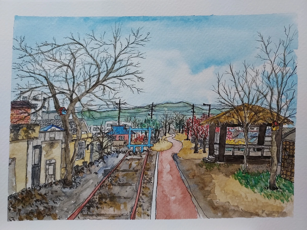요즘에는 공원 길가에 초등학생들이 그린 그림을 전시해 놓았다. 도서관 가는 길에 보게 되는 동심이 꿈꾸는 마을과 공원 풍경을 그린 아이들 그림은 기특하고 예쁘다. 그래서 변화된 철길 풍경을 사진 찍어 와 그려 보았다.