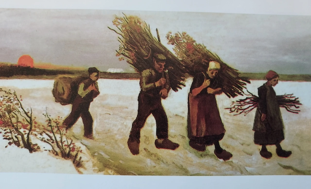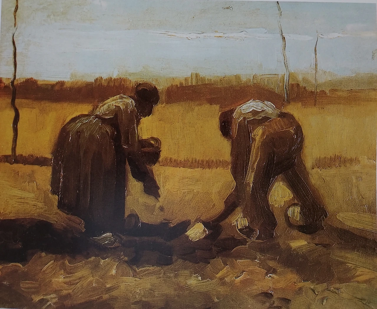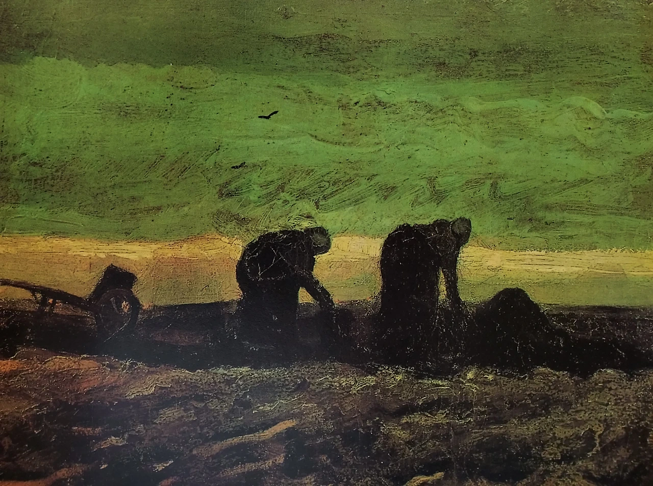 겨울철 연료로 사용하기 위해 토탄을 줍고, 추위를 견디기 위해 땔감을 구하고, 땅을 파서 감자를 심는 사람들, 고흐는 자신과 동시대를 살아가는 자연의 불친절함을 온몸으로 마주 대하고 있는 사람들을 그림의 소재로 삼았다. 토탄을 줍기 위해 90도로 꺾인 허리와 추위를 견뎌야 하기에 추위를 무릅쓰고 무겁게 땔감을 지고 발걸음을 옮기는 지친 얼굴들, 감자를 심기 위하여 90도로 숙여진 몸을 그림으로써 살아가는 일에 대한 숙연함과 준엄함을 보여 준다.