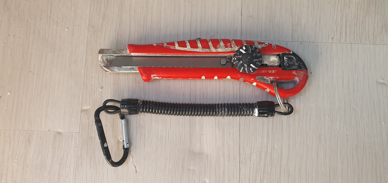 필수 공구입니다. 사장님께 기술을 배우기 시작할 때부터 커터칼은 준비해서 다니세요. 항상 작업복 주머니에 있어야 합니다. 커터칼은 작업 시 자주 사용하는 공구입니다. 테이핑 된 박스나, 묶인 줄을 자를 때 사용하고 실리콘 제거할 때 필요합니다. 이외에도 다양한 곳에서 사용되죠. 저는 위 사진처럼 스프링 줄에 달아 작업복 주머니에 매달아 놓습니다. 이렇게 해야 필요할 때마다 찾아야 하는 불편함을 줄일 수 있습니다.